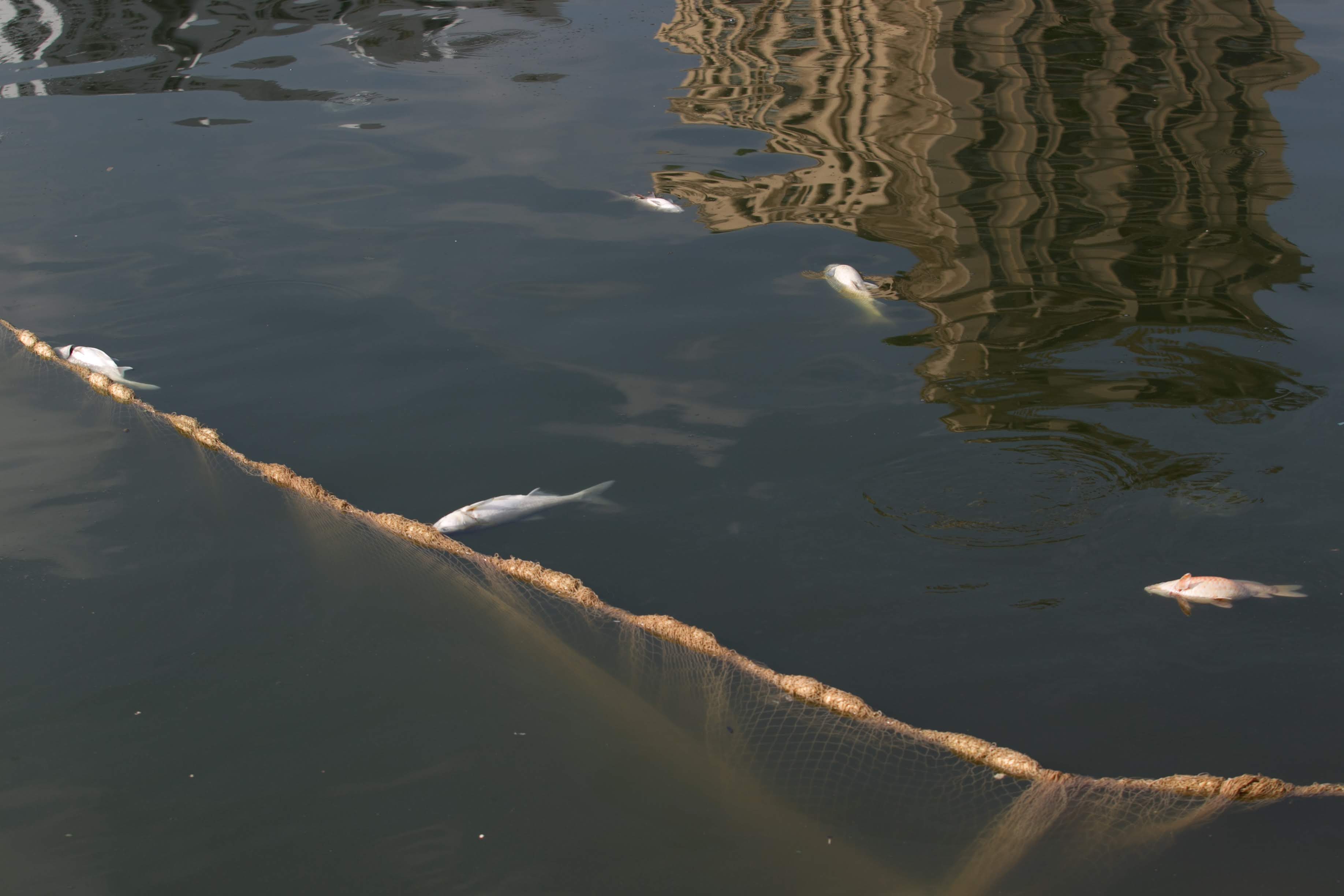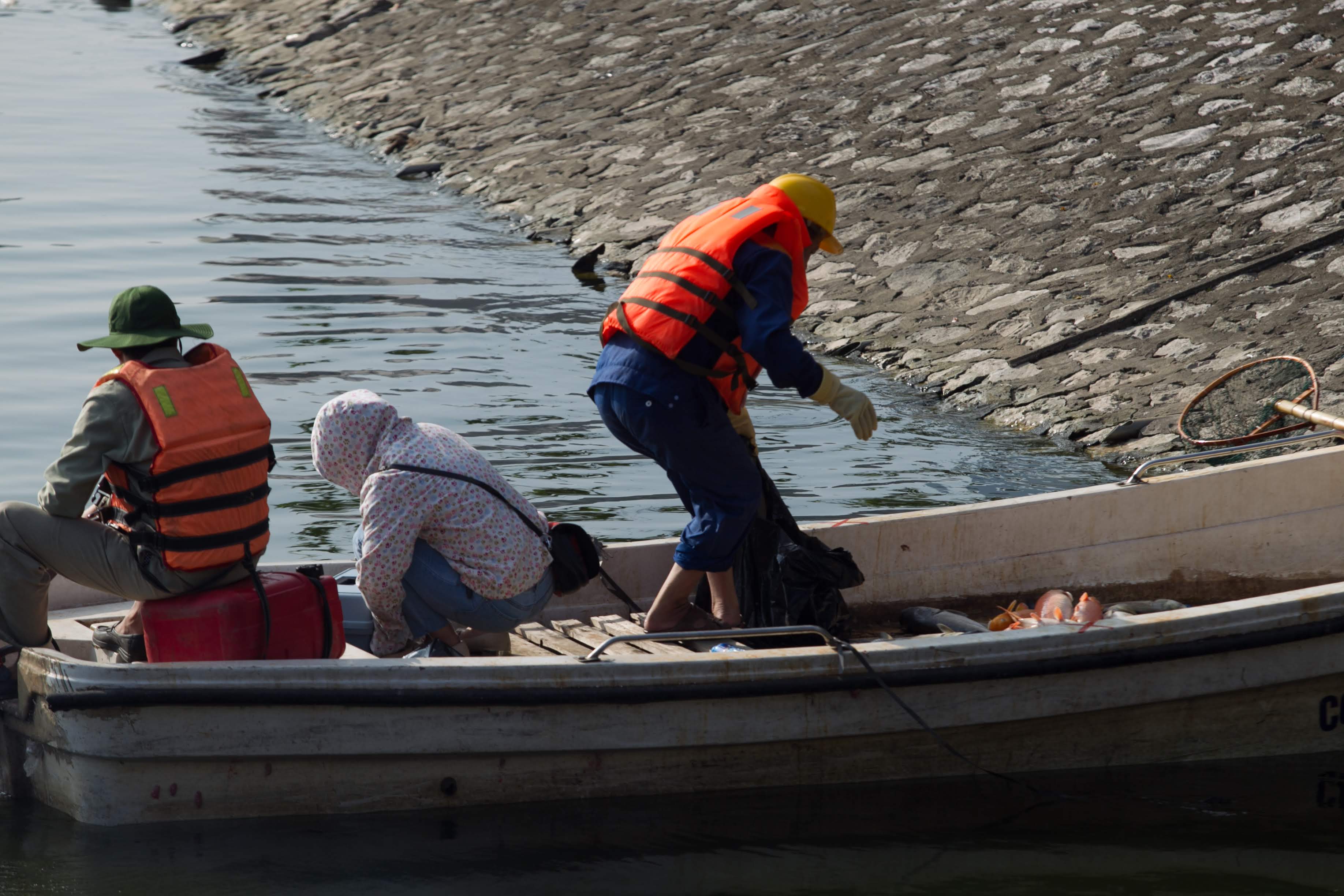 Công nhân môi trường thu gom cá, đồng thời lấy mẫu nước để mang về xét nghiệm.