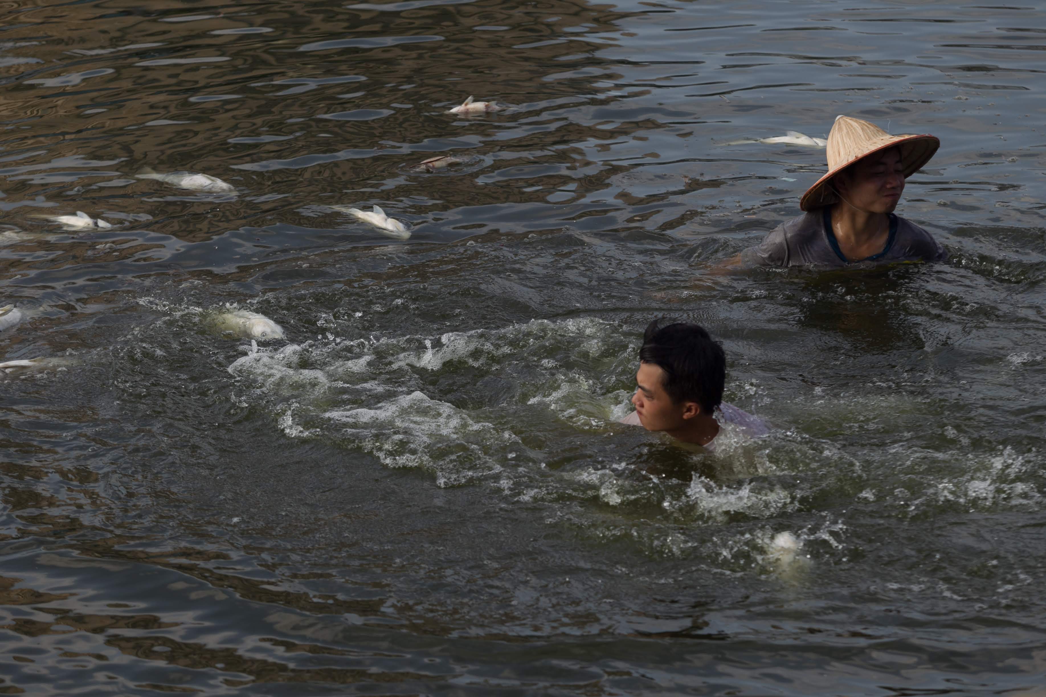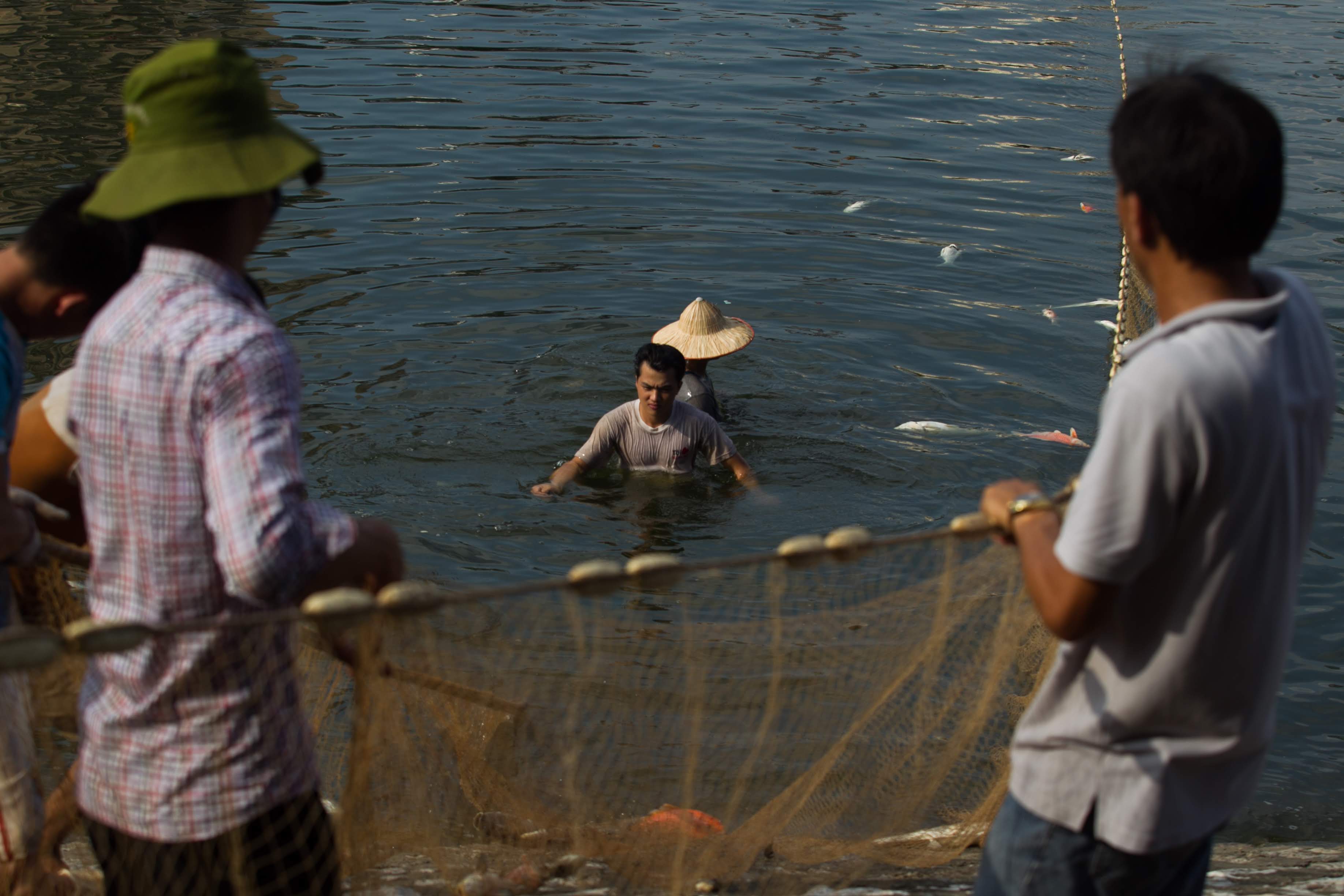 Không chỉ có đội công nhân vệ sinh môi trường, những người dân có mặt cũng xuống hồ phụ vớt cá lên.