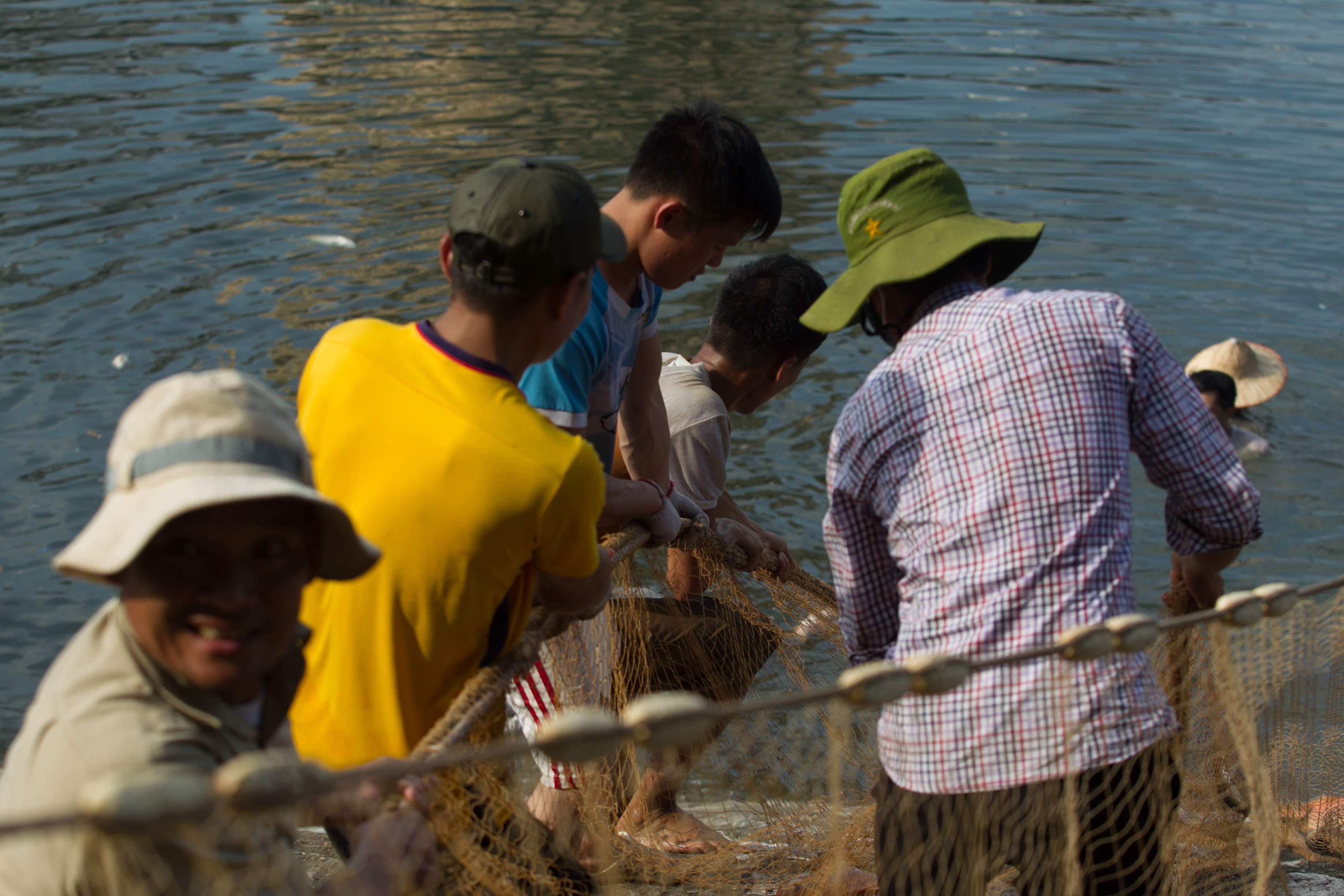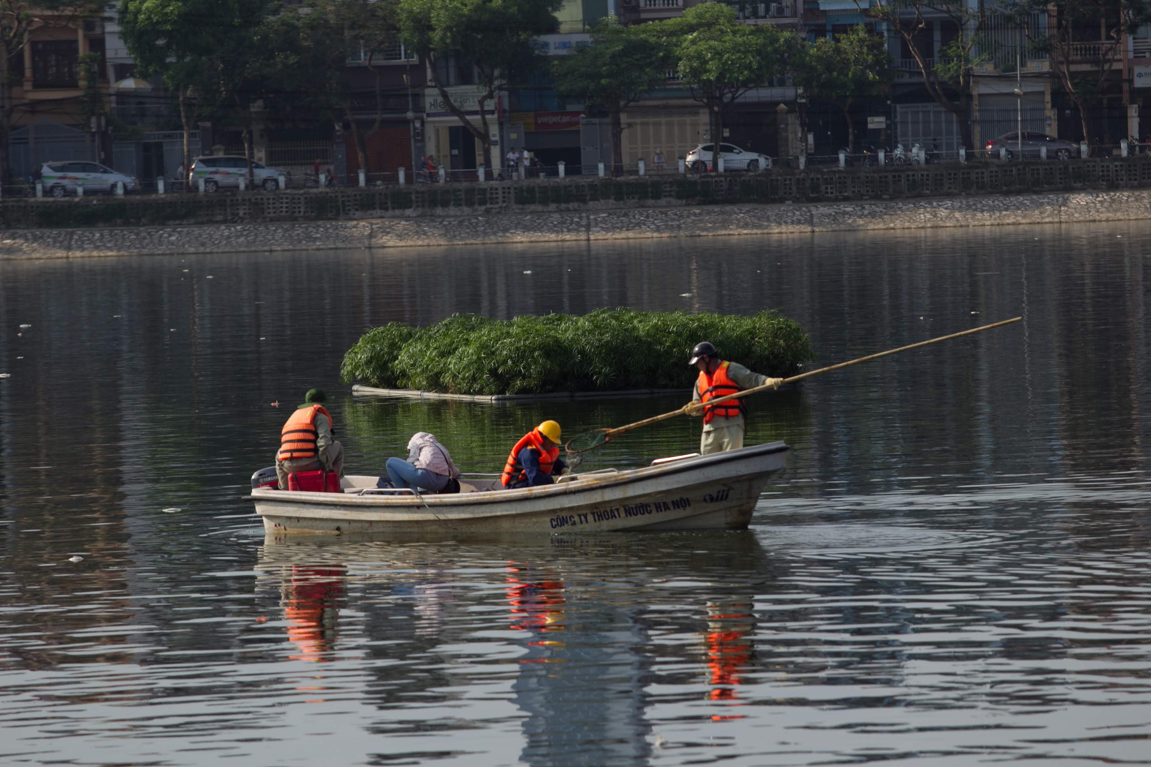 Trên mặt hồ, các thuyền viên đang di chuyển để vớt cá.