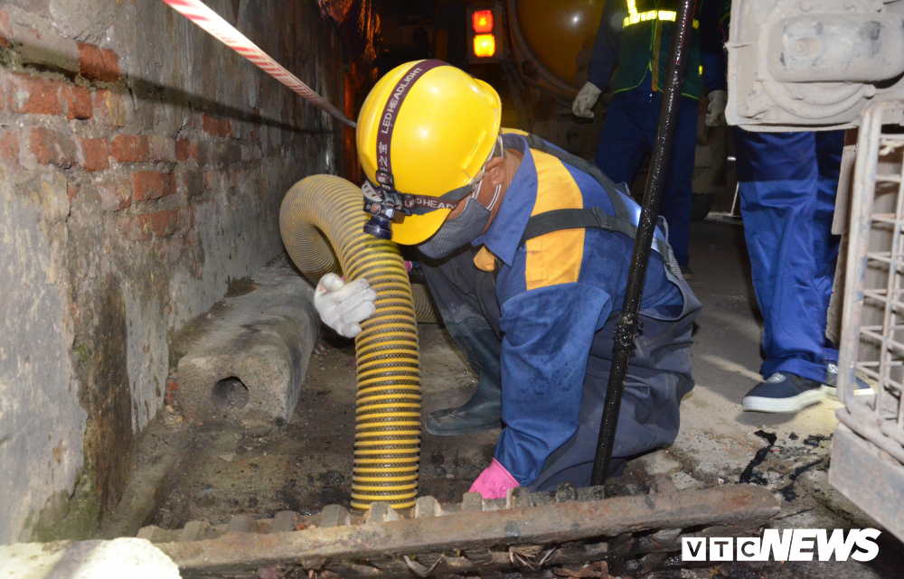 Những đường ống dài cả chục mét luồn sâu xuống cống để hút bùn thải lên. Ảnh: báo VTC News
