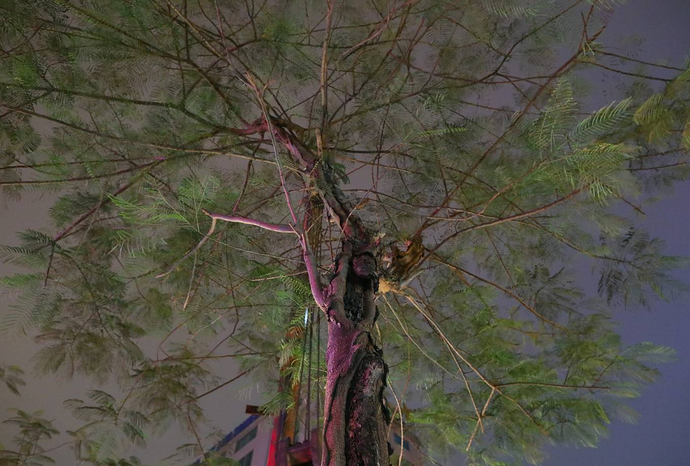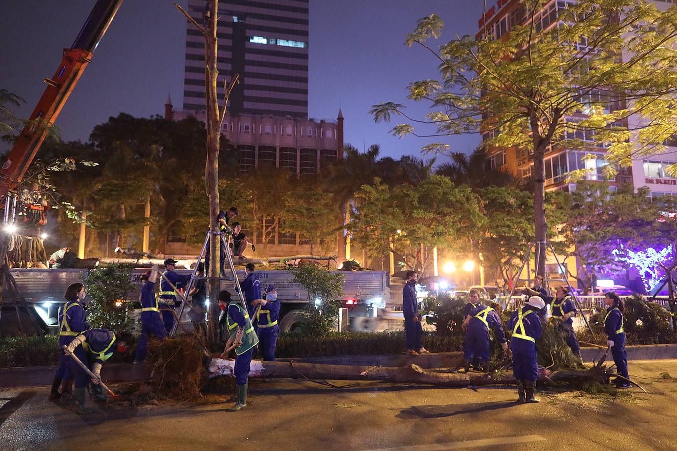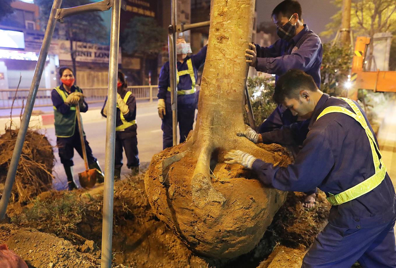 Đêm 2/4, khoảng 50 công nhân của Công ty cây xanh Hà Nội đã làm việc trong ánh đèn đường để thay thế những cây phượng bị sâu mục trên các tuyến phố Láng Hạ, Xã Đàn, Hoàng Cầu.