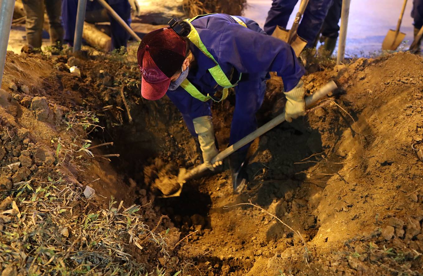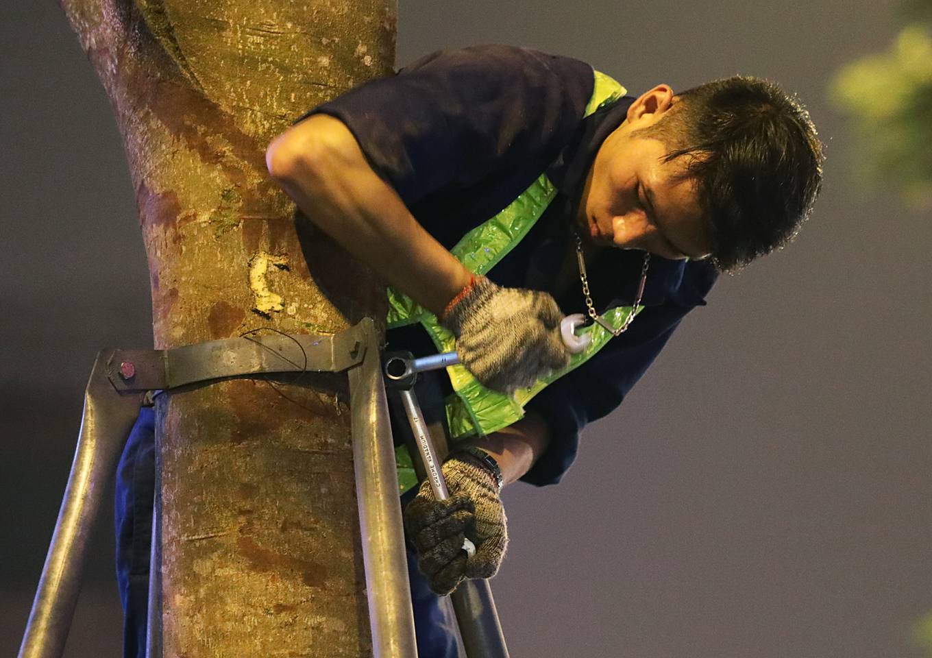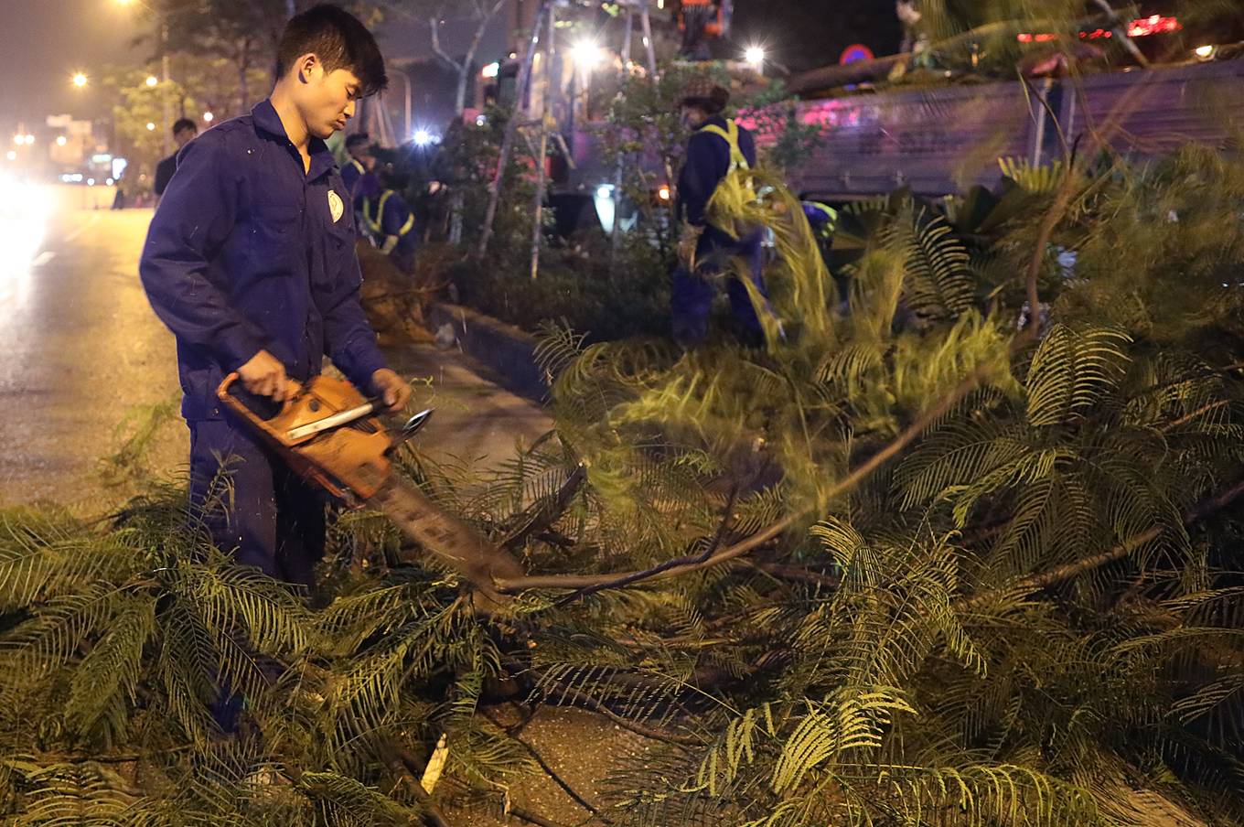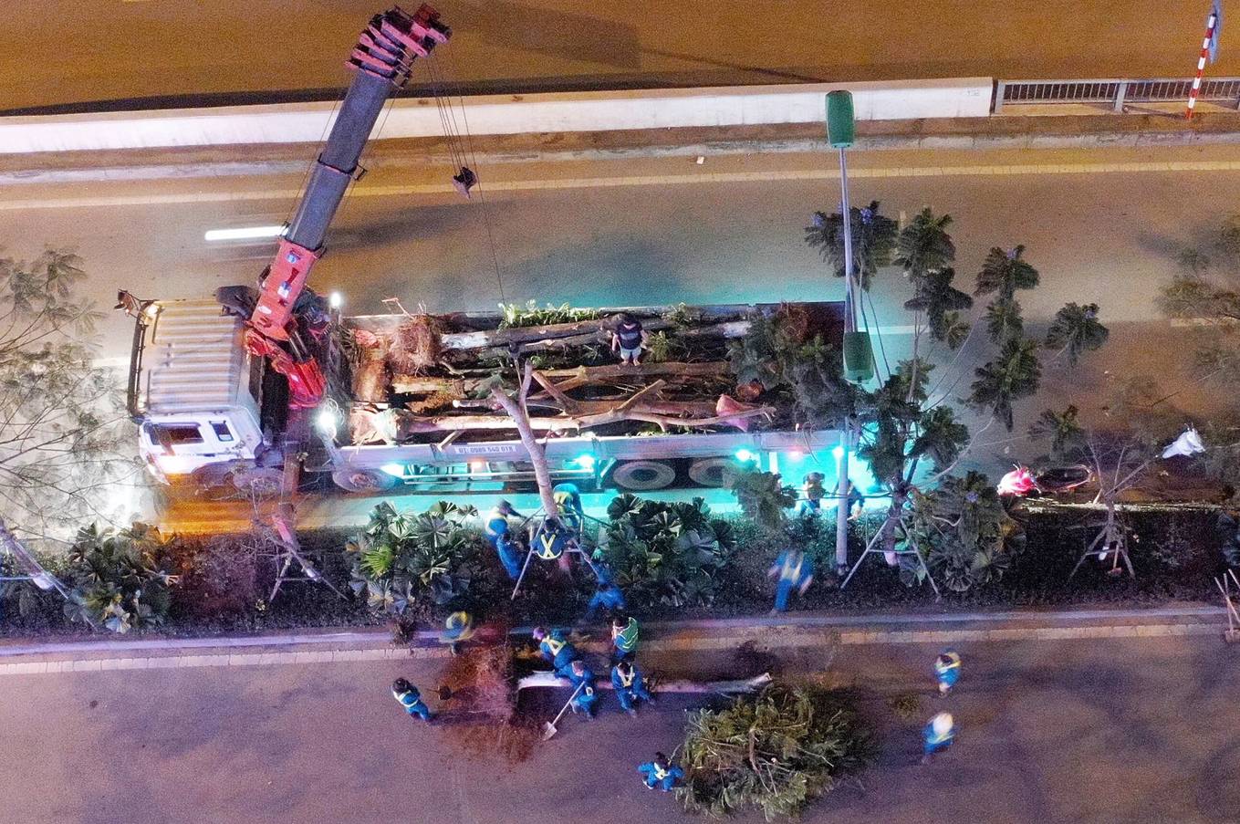 Đêm 2/4, khoảng 50 công nhân của Công ty cây xanh Hà Nội đã làm việc trong ánh đèn đường để thay thế những cây phượng bị sâu mục trên các tuyến phố Láng Hạ, Xã Đàn, Hoàng Cầu.