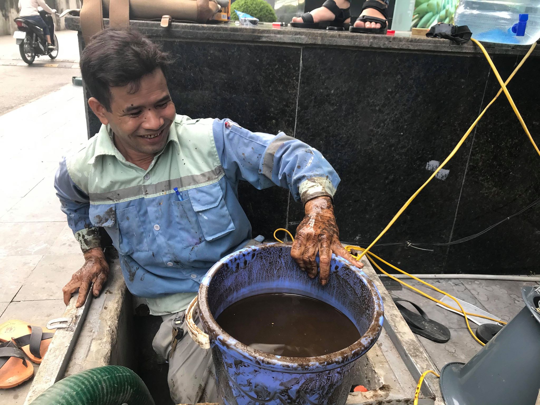 Hình ảnh bể khu chung cư chứa đầy chất có mùi dầu sau sự cố tràn dầu thải gần Công ty cổ phần nước sạch sông Đà