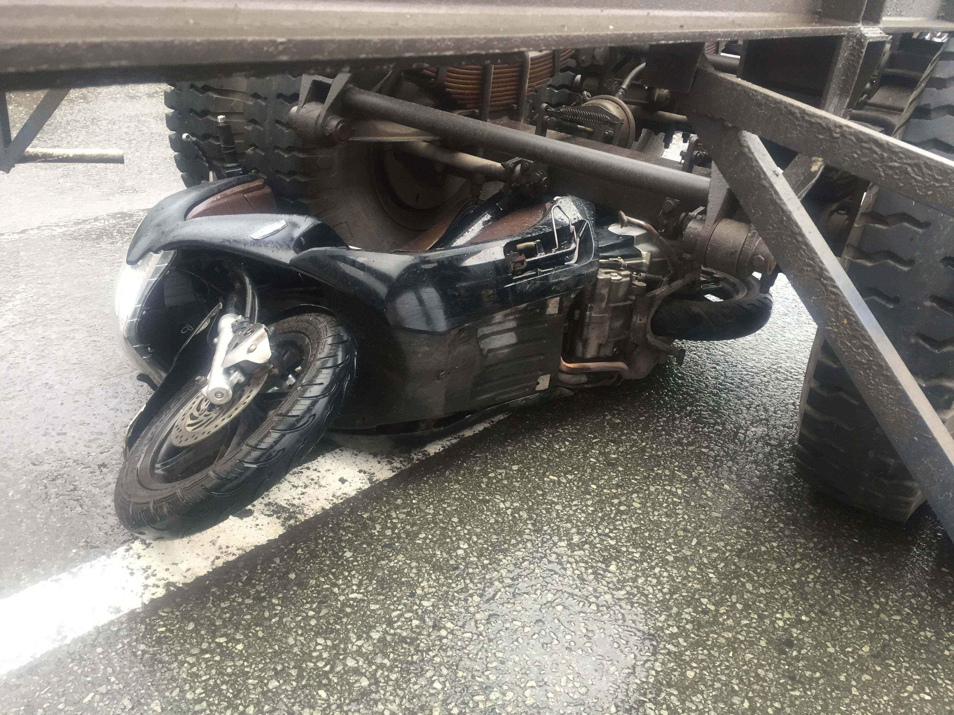 Xe máy nằm dưới gầm xe container.