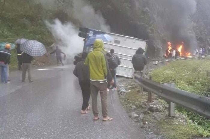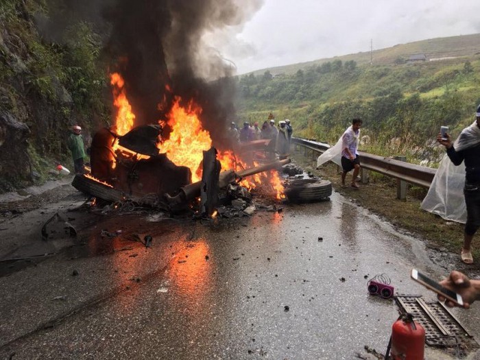 Cú tông mạnh khiến chiếc xe đầu kéo văng ra xa sau đó bốc cháy ngùn ngụt. Tại hiện trường, chiếc xe container gặp nạn nằm chắn ngang đường, phần đầu kéo văng ra xa cách rơ moóc bốc cháy khoảng 20m.