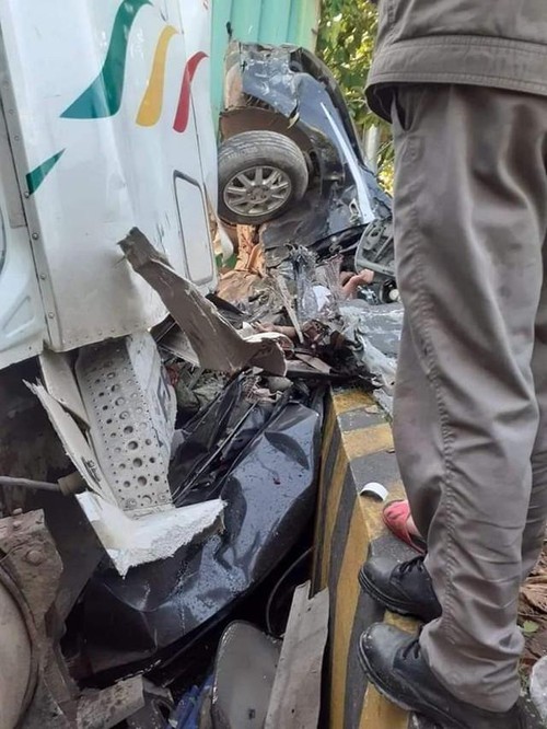 Đầu container bị hư hỏng nặng, ô tô bị biến dạng