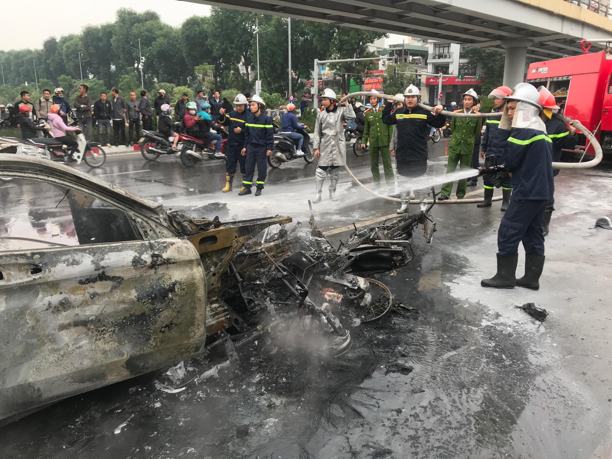 Ngay lập tức, tổ công tác đã báo cáo BCH Đội nắm được và chỉ đạo tổ công tác tiếp cận hiện trường vụ tai nạn. Khi tiếp cận hiện trường thì xe ô tô cùng 02 xe mô tô và xe đạp đã bốc cháy phát ra nhiều tiếng nổ. Tổ công tác phát hiện người đàn ông mặc áo màu xanh nhãn hiệu Grab bị mắc kẹt giữa ô tô và xe máy không thể rút chân ra được, toàn bộ phần ống quần của người đàn ông này cũng đang bốc cháy.