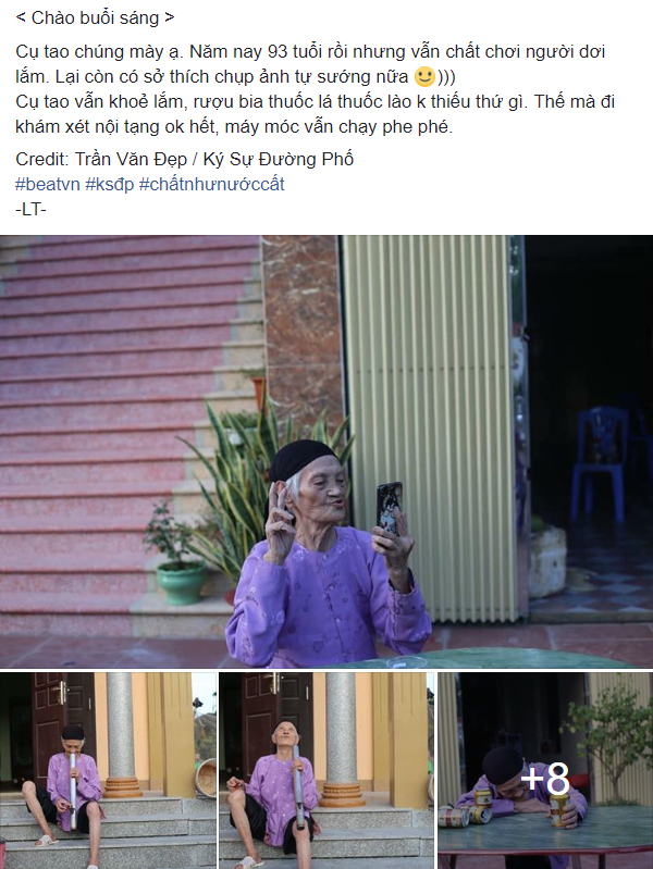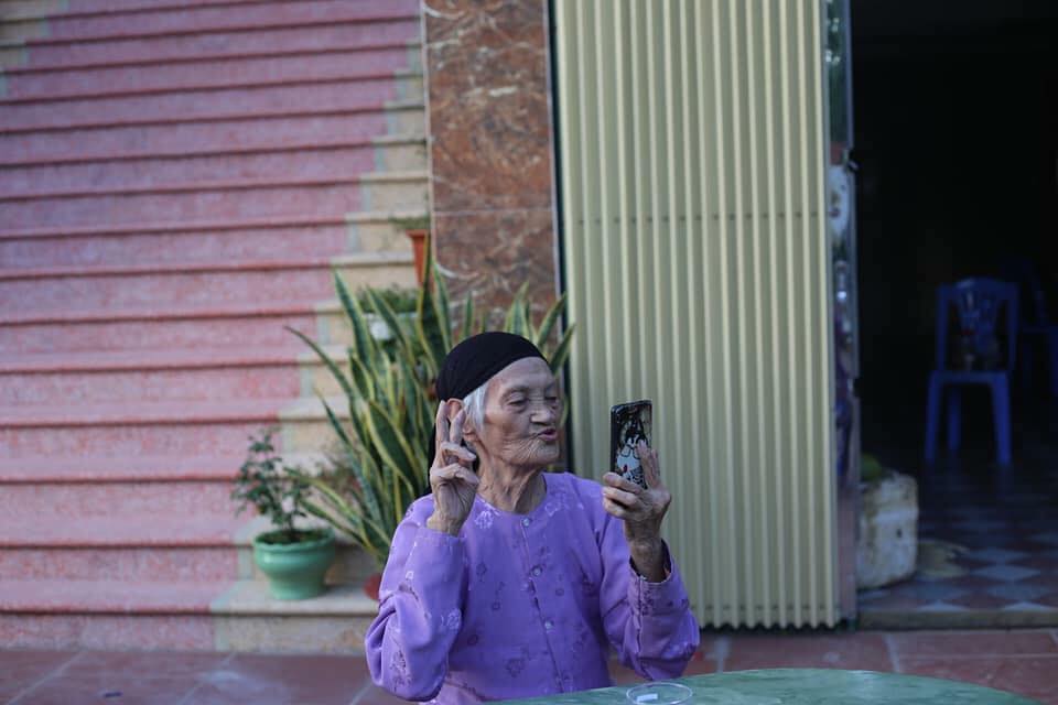 Đặc biệt, cụ bà còn có sở thích chụp ảnh “tự sướng” khiến người nhiều trầm trồ, thích thú. Hiện tại cụ có thể tự cầm máy điện thoại, mở camera trước và chụp những kiểu ảnh với nhiều kiểu dáng cực kì xì tin.
