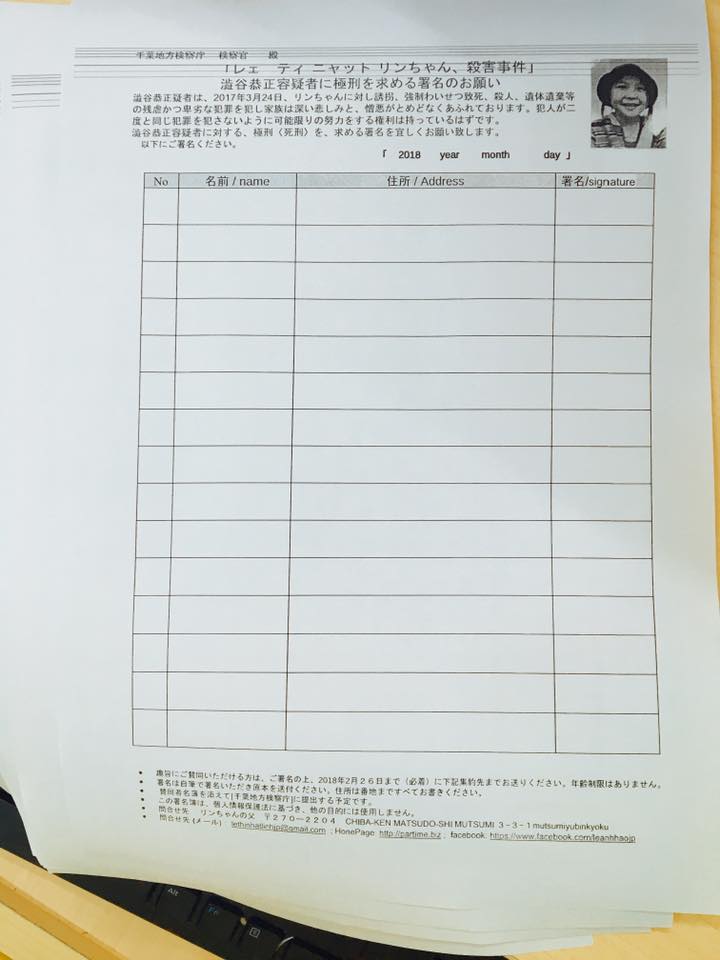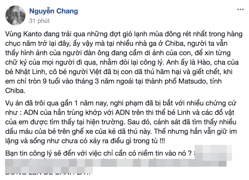 Trước đó, bé Lê Thị Nhật Linh, 9 tuổi, học sinh lớp 3 tiểu học tại thành phố Matsudo, tỉnh Chiba đã bị bắt cóc khi đang trên đường tới trường và sau đó bị giết hại. Bé Linh mất tích vào sáng 24/3 khi đang đến trường một mình. Sáng sớm 26/3, thi thể bé được tìm thấy cạnh bãi cỏ bên con sông tại thành phố Abiko, tỉnh Chiba, cách nhà bé khoảng 10 km.