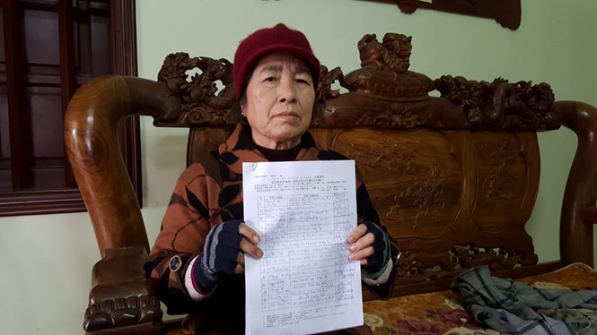 Bà ngoại bé Nhật Linh với tờ giấy có chữ ký của mọi người. (Ảnh: Thanh Niên)