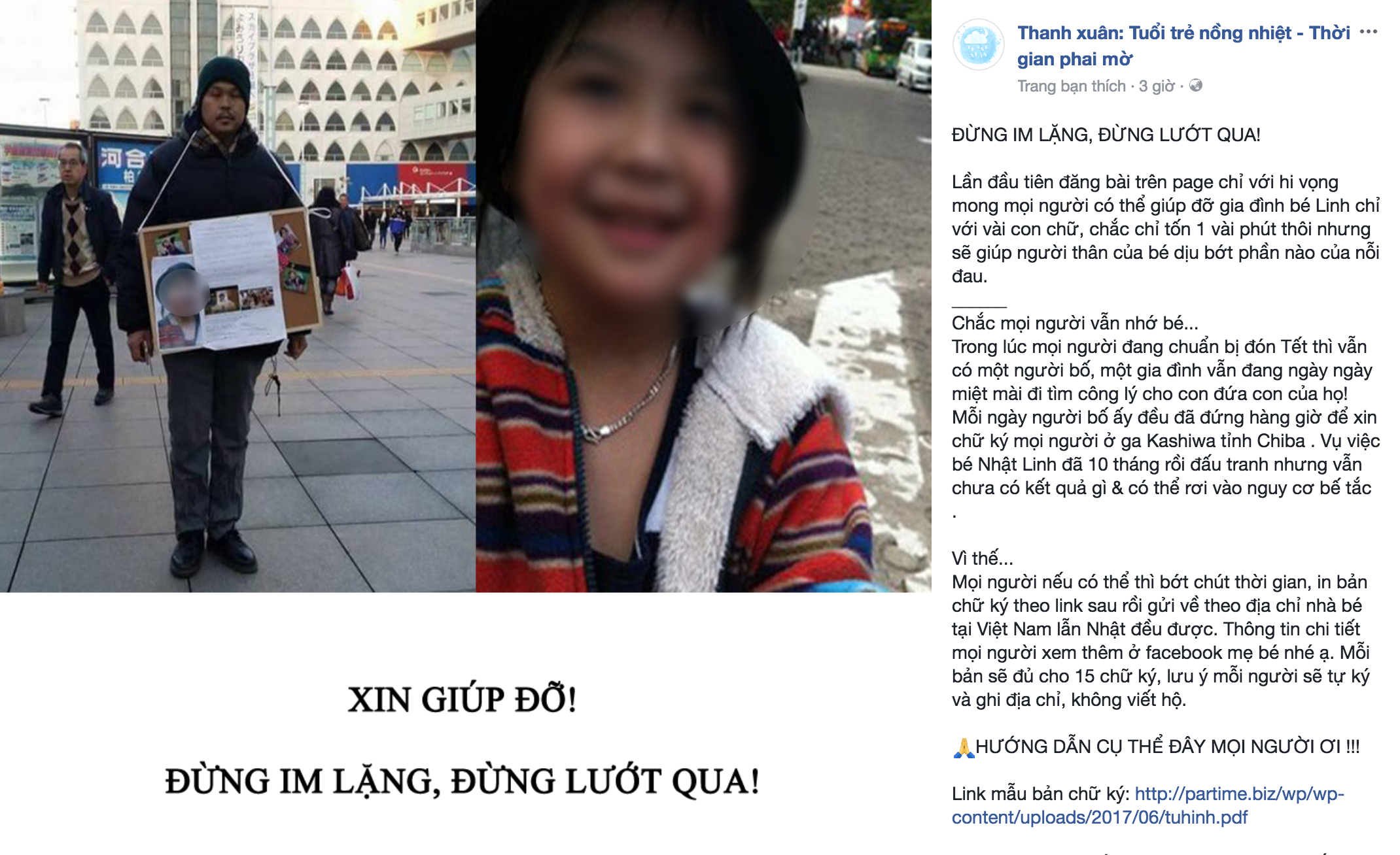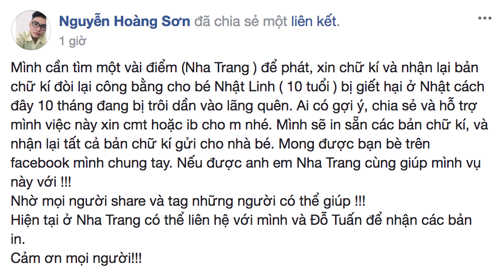 Đã vài ngày trôi qua kể từ khi gia đình bé Nhật Linh kêu gọi cộng đồng mạng giúp đỡ bằng cách ký tên vào mẫu để đòi lại công bằng cho bé. Trên mạng xã hội, dễ dàng bắt gặp các đoạn chia sẻ, lời kêu gọi của cư dân mạng xin đủ vài chục nghìn chữ ký nữa để gửi cho gia đình Nhật Linh.
