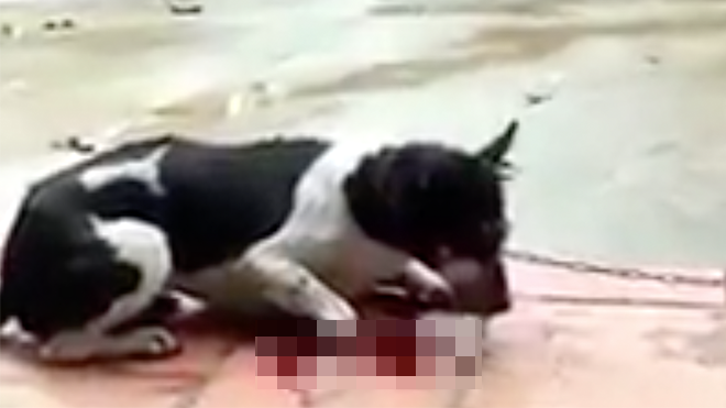 Sau vài lời la mắng chú chó nhỏ, người phụ nữ trung niên lôi chó ra sân nhà rồi thẳng tay chặt đứt lìa chân trước phải của chó, chú chó không kịp định thần thì đã mất hẳn một chân, vì quá đau đớn nên oằn mình giãy giụa, kêu vài tiếng yếu ớt rồi nằm phịch xuống sàn nhà.