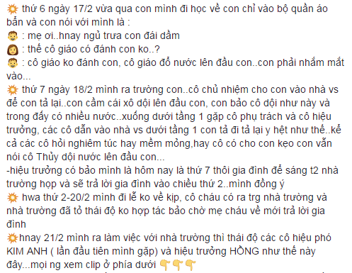 Sự việc mới đây được chia sẻ trên một page tin tức khá nổi trên facebook. Theo đó, một người mẹ trẻ đã chia sẻ việc con trai đi học tại một trường mầm non chất lượng cao tại Hải Phòng và bị cô giáo cầm xô nước dội lên đầu chỉ vì bé tè dầm.