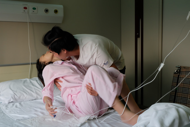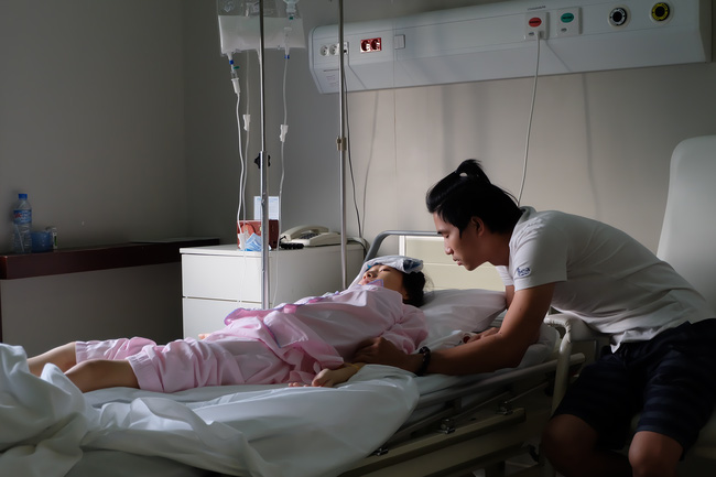 Lê Kỳ dịu dàng nắm tay bạn gái trong phòng bệnh.