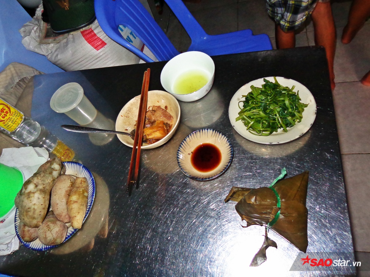 Bữa ăn đơn sơ với rau, khoai, chút thịt và chiếc bánh ú còn từ đêm hôm trước.
