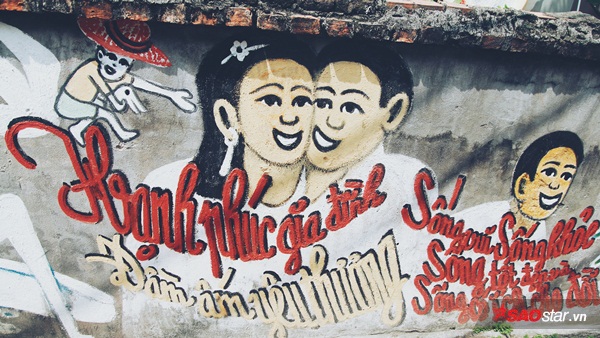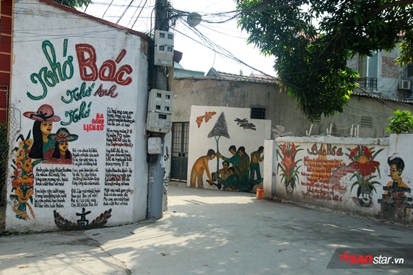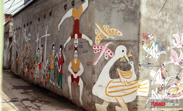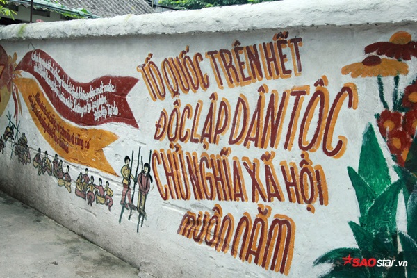 Từ cổng ngõ Ao Dài đến các con hẻm đều là những bức tranh tuyệt đẹp. Vì là một Đảng viên nên tranh tường của cụ tập trung tái hiện cảnh ấm cúng gia đình, tình làng nghĩa xóm, cảnh người dân nô nức lao động, cảnh đạo hiếu hay những khẩu hiệu, lời căn dặn của Bác Hồ.