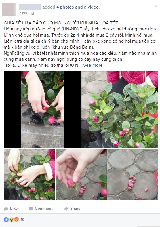 Nhiều độc giả khác cũng tranh thủ tâm sự chuyện mua phải hoa giả trong ngày Tết của mình: Ban Thanh Tùng cho hay: “Đi chợ hàng mua cây lộc vừng rõ nhiều hoa từ gốc đến ngọn, trưa về héo hết. Hóa ra nó gắn keo voi, không được 1 cái hoa nào luôn”. Nickname Thủy Bom thì chia sẻ: “Nhà mình có 2 chậu hoa toàn nụ là nụ, về nở được 3 bông, bây giờ héo hết. Bảo sao!”