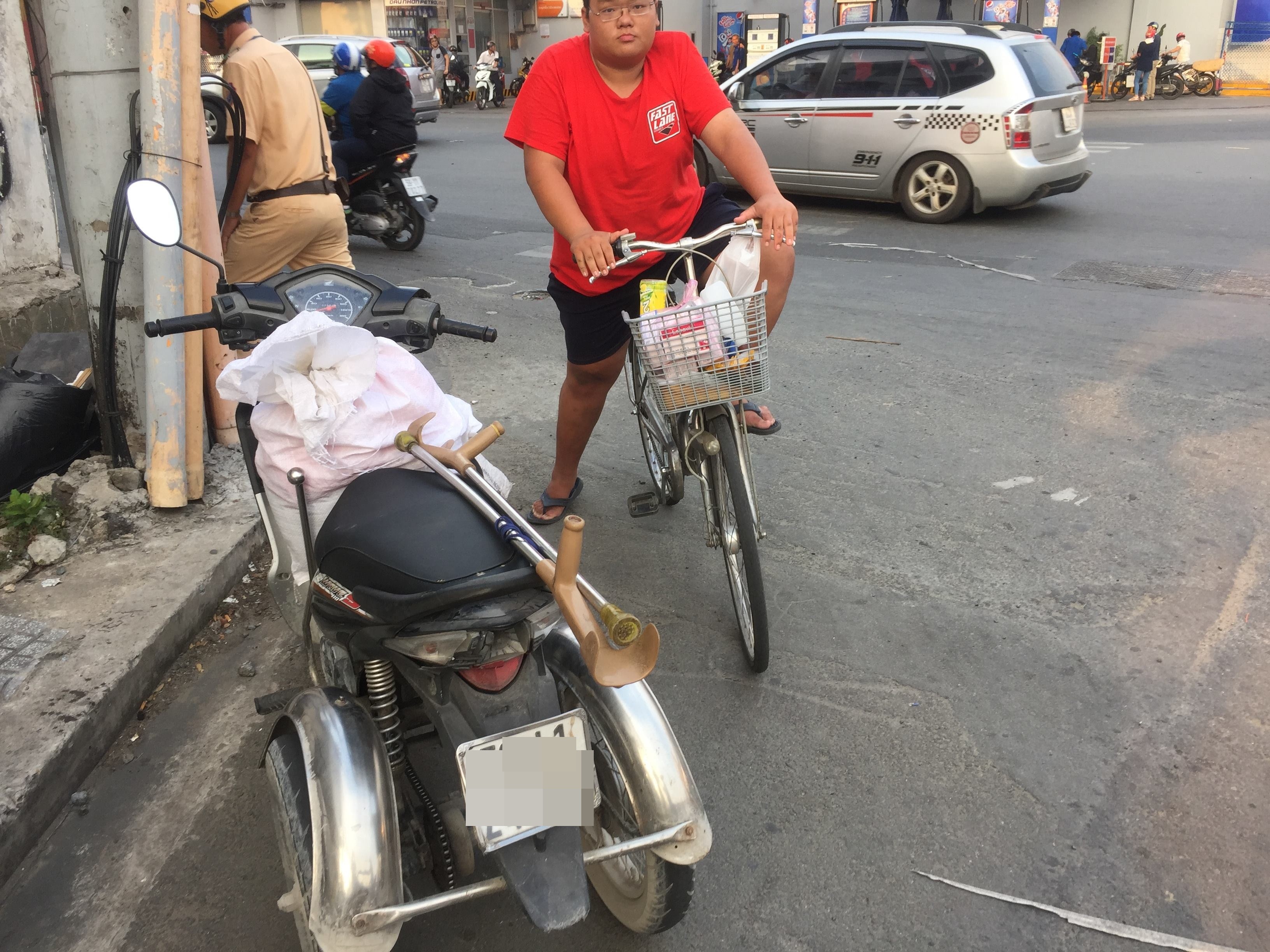 Xe 3 bánh của người khuyết tật được đưa vào lề đường để tránh ùn ứ giao thông.