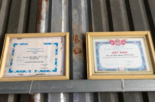 Những bằng khen, giấy khen của chị Thanh được treo cạnh vách tôn trong tiệm may. Ảnh: Hữu Danh