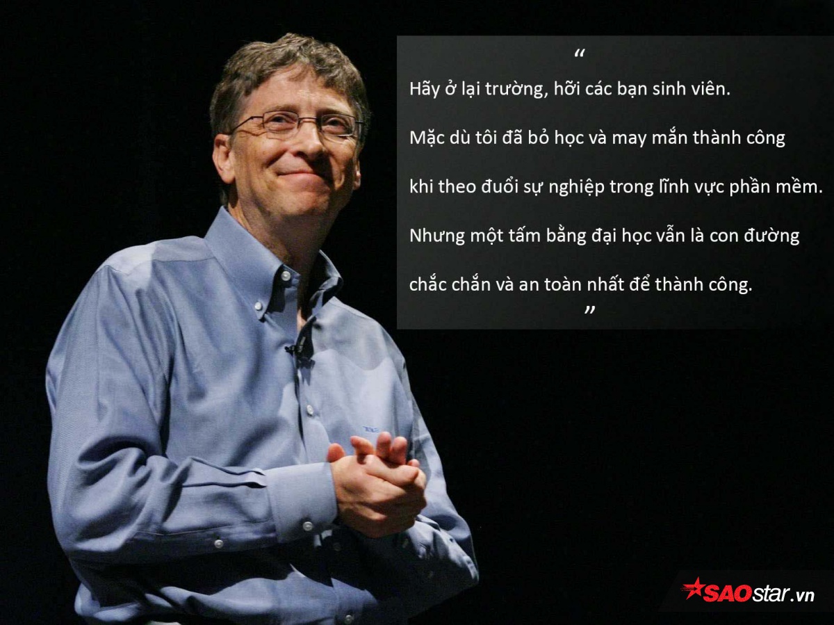 “Hãy ở lại trường hỡi các bạn sinh viên. Mặc dù tôi đã bỏ học và may mắn thành công khi theo đuổi sự nghiệp trong lĩnh vực phần mềm. Nhưng một tấm bằng đại học vẫn là con đường chắc chắn và an toàn nhất để thành công.”