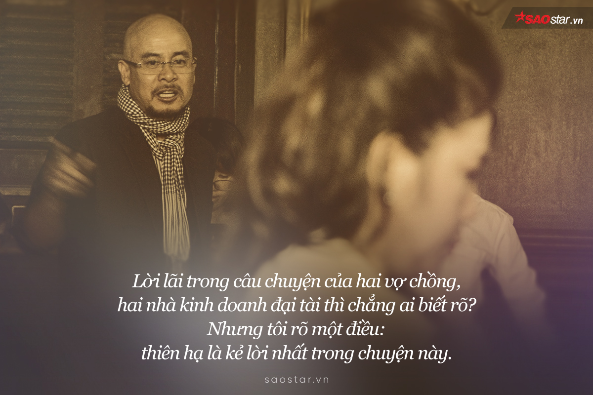 Số tiền nghìn tỷ đồng sẽ chia thế nào? Ai nhận nhiều hơn? 4 đứa con sẽ sống sao? Ai mới là “vua cafe duy nhất của Việt Nam”?,… quyết định khó khăn ấy sẽ còn tiếp diễn trong sự cãi vã không hồi kết vào tuần sau. Lời lãi trong chuyện của hai vợ chồng, hai nhà kinh doanh đại tài thì chẳng ai biết rõ? Nhưng tôi rõ một điều: thiên hạ là kẻ lời nhất trong chuyện này. Vì mấy đời thiên hạ mới lại được chứng kiến ‘nước mắt chảy thành sông’ từ những nhà giàu.