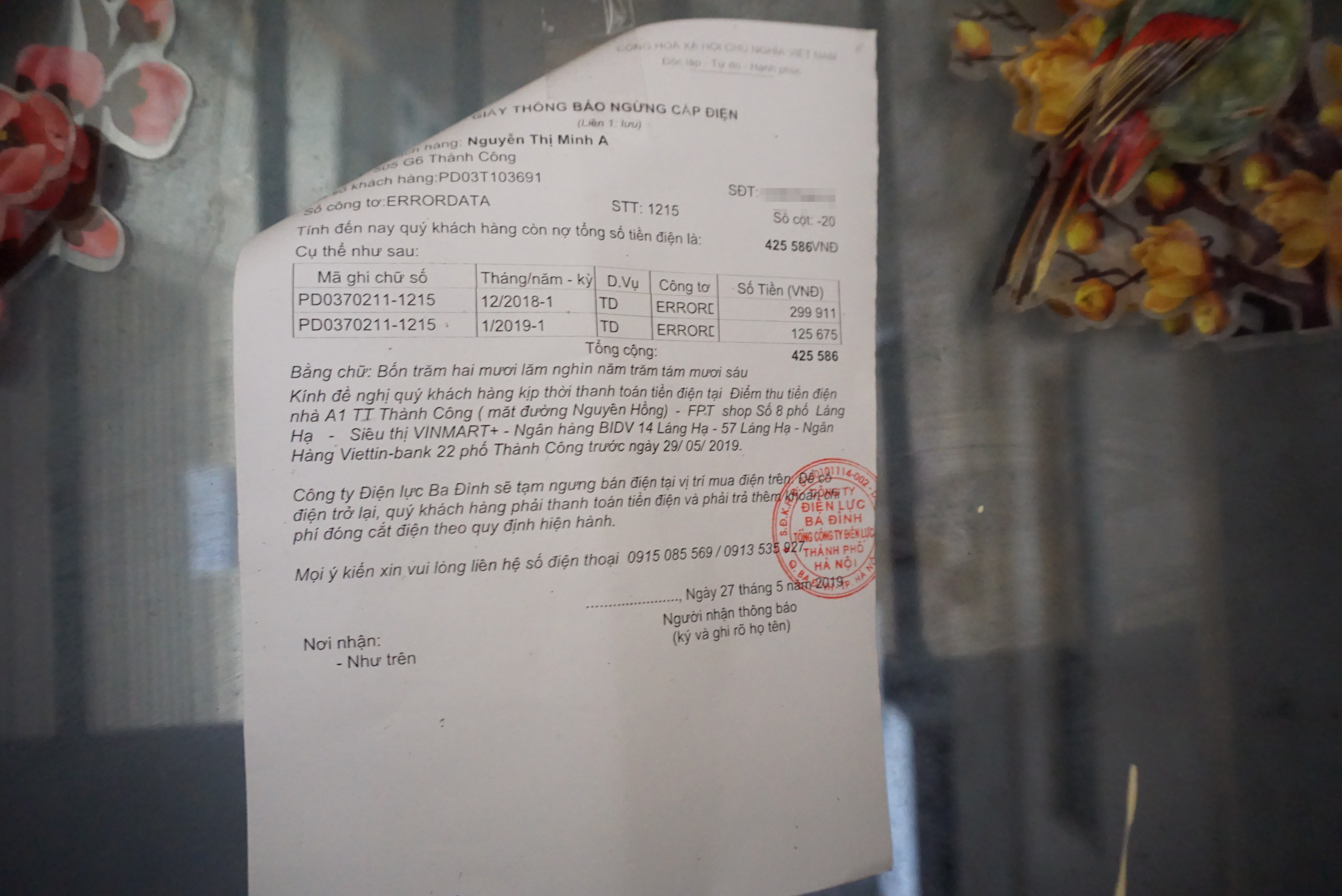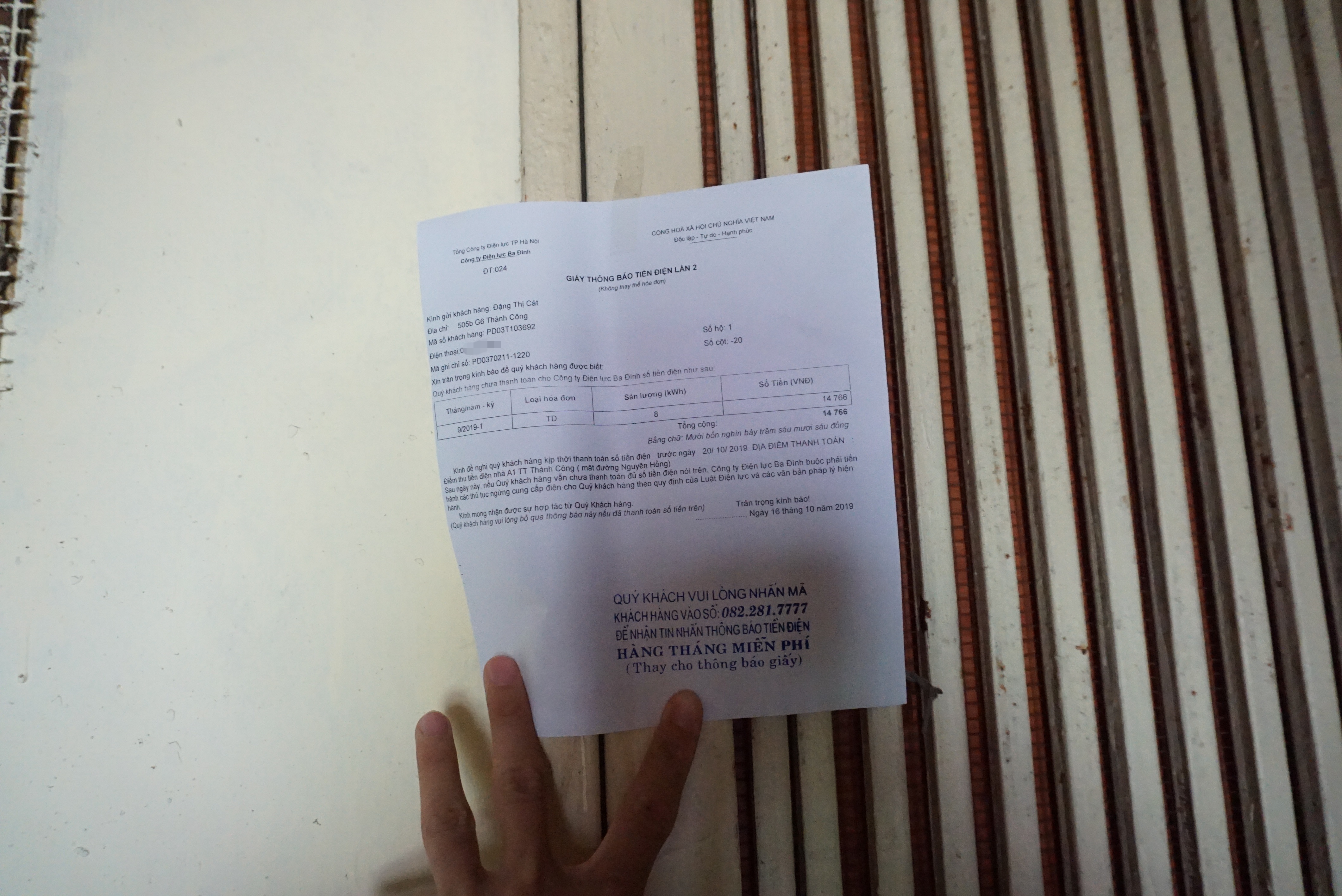 Hoá đơn thanh toán tiền điện được dán trước cửa những gia đình đã di chuyển đi.