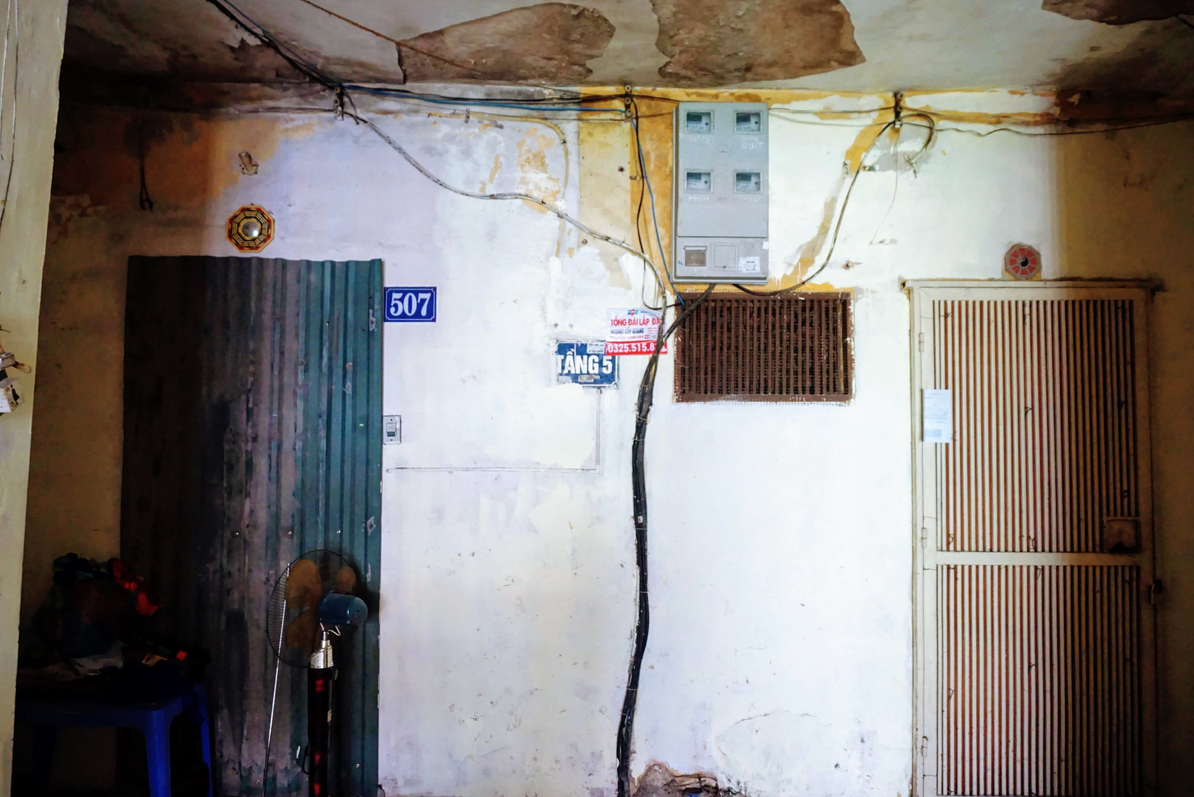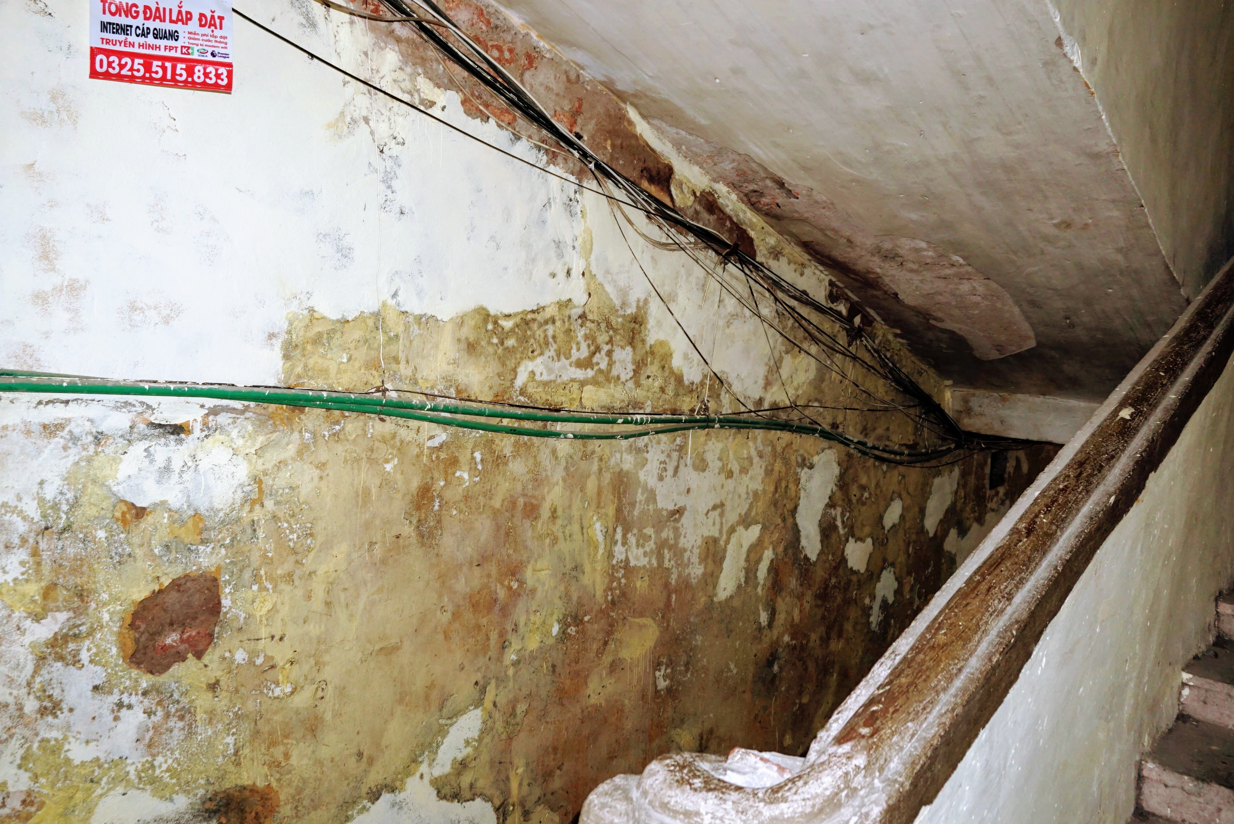 Bên trong khu tập thể, ống nước, dây điện chạy chằng chịt khắp hành lang, cầu thang. Trần nhà ẩm thấp và đóng rêu phong.