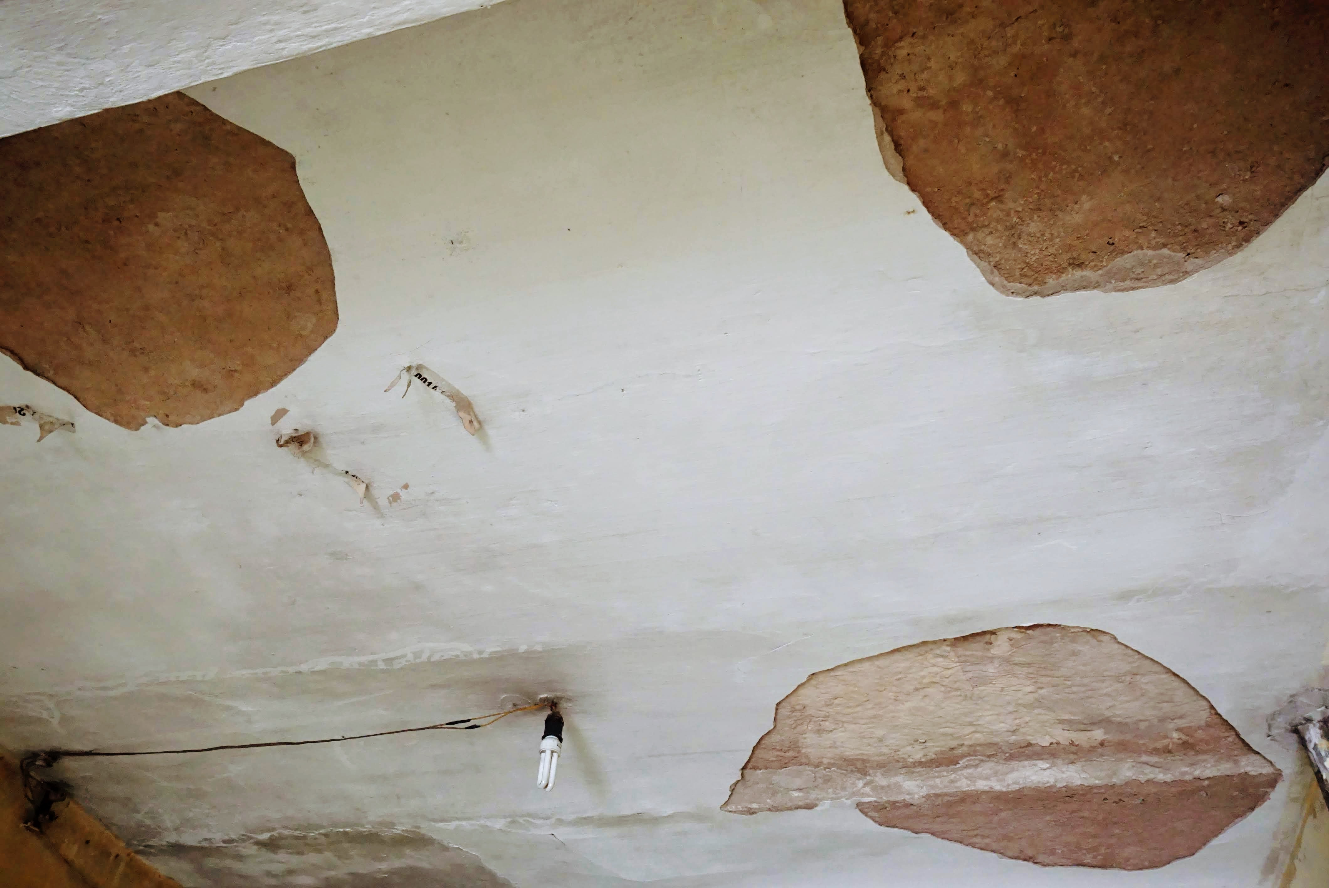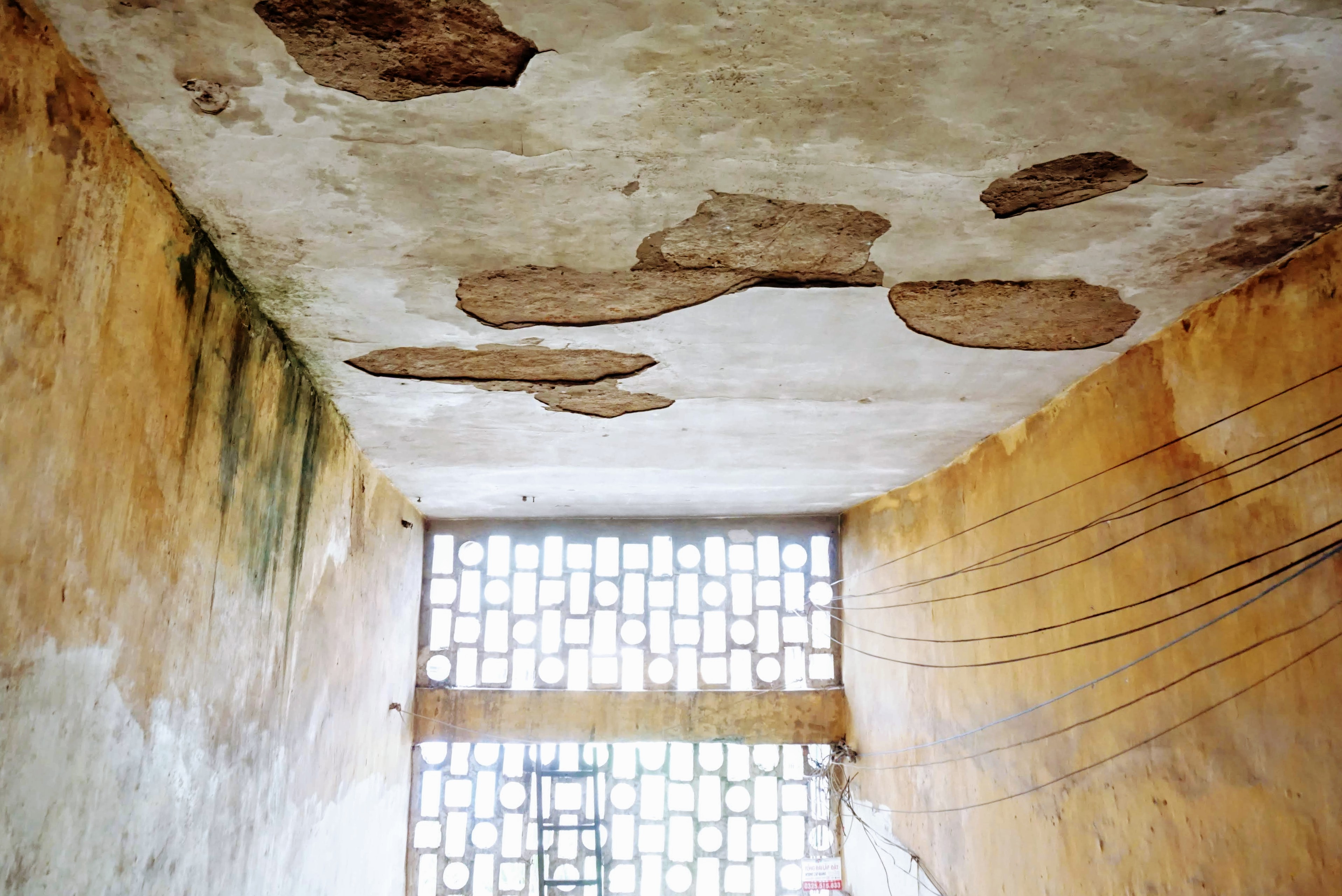 Khu hành lang nhiều mảng tường, trần bong tróc. Có khu vực dầm bong hết lớp bê tông bảo vệ để lộ lớp thép hoen rỉ, kết cấu không đảm bảo. Nhiều mảng vữa bong tróc, trơ cả khung dầm.