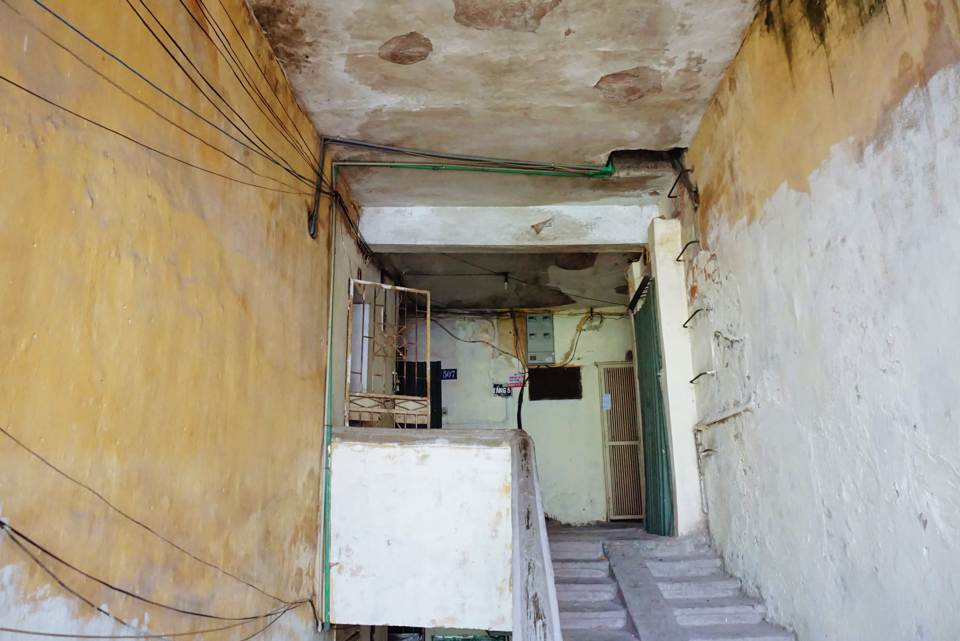 Cầu thang và lối đi chung đã bong tróc, cho thấy dấu thời gian hằn lên khu nhà ở này.