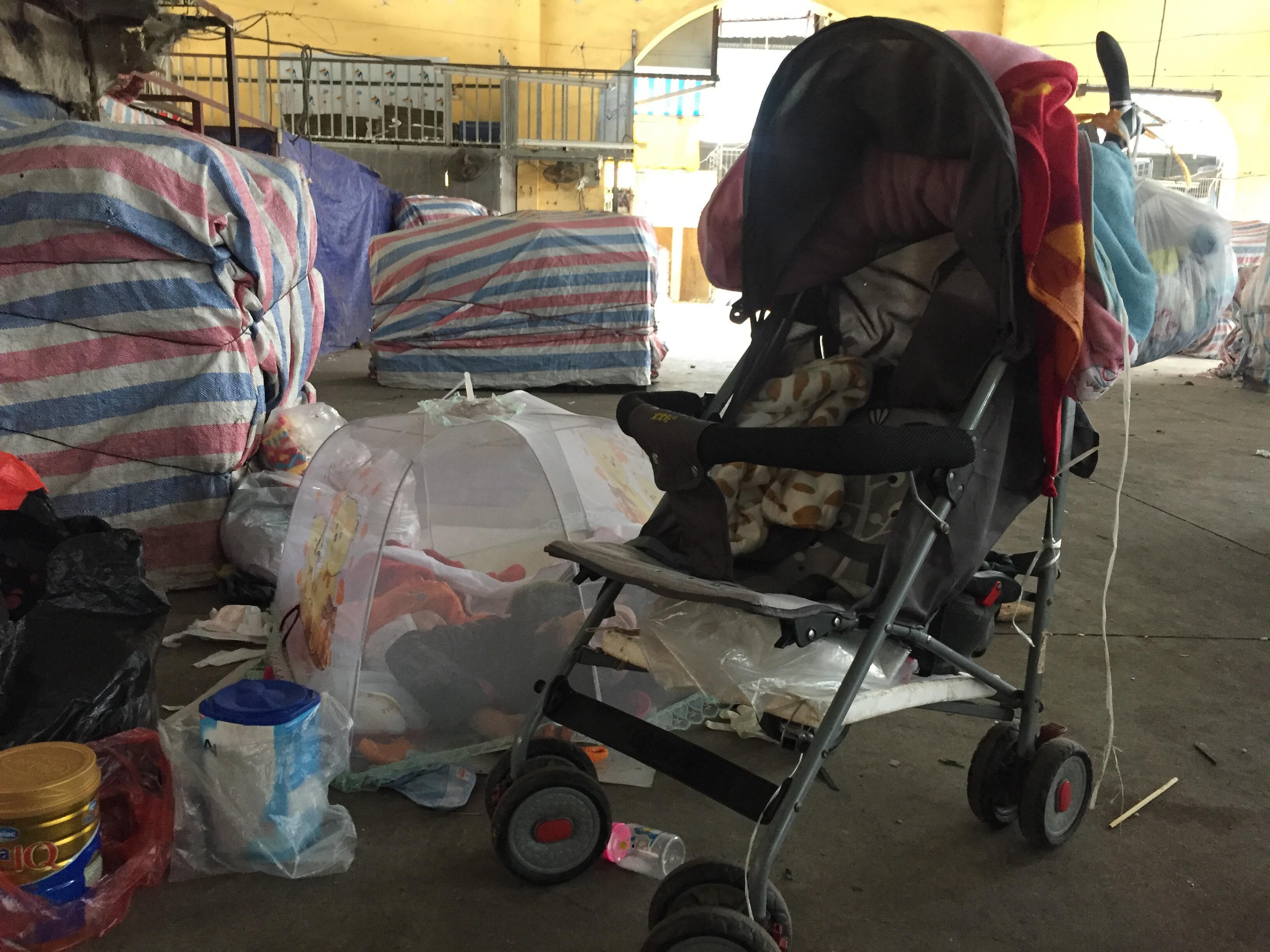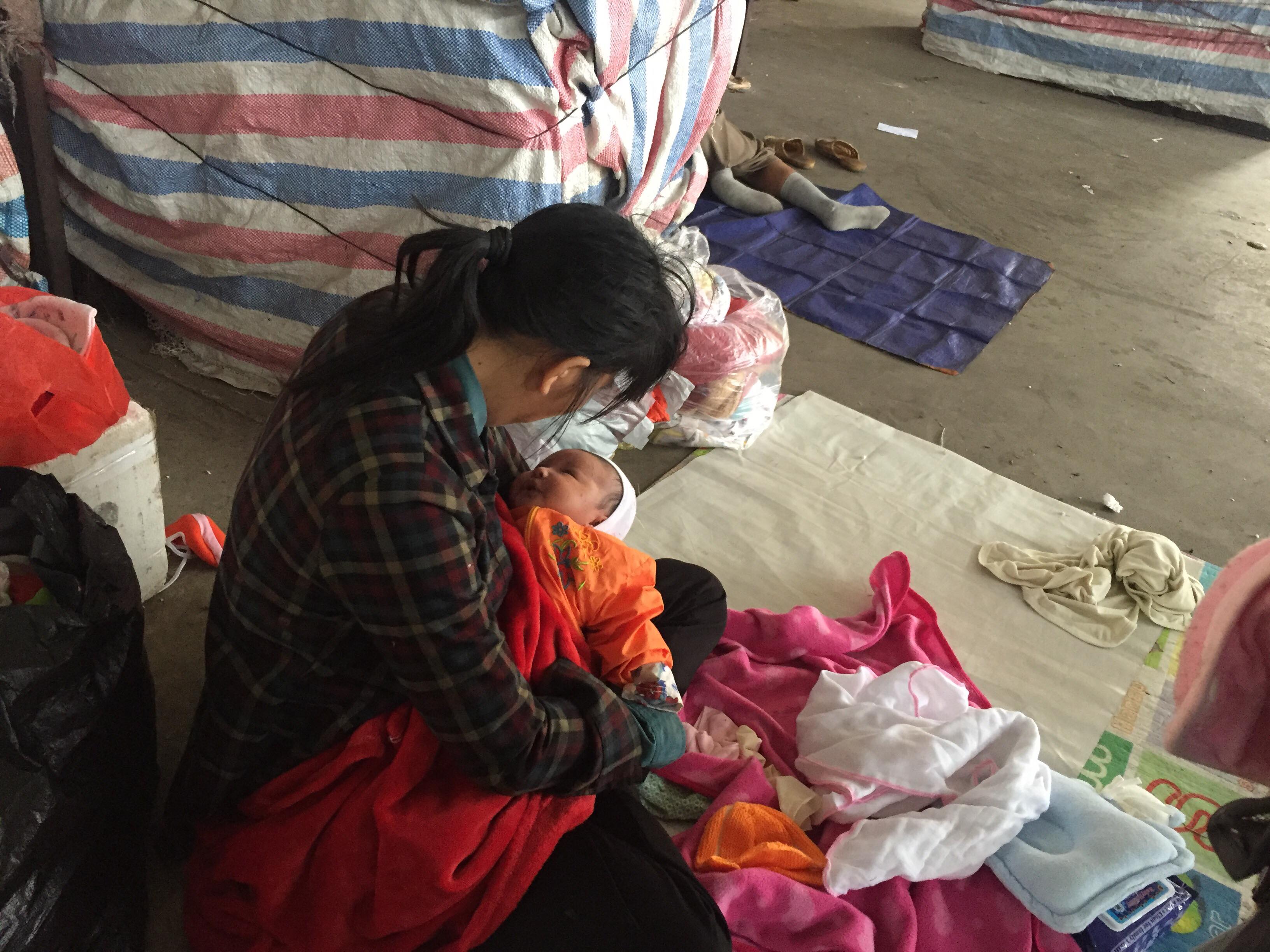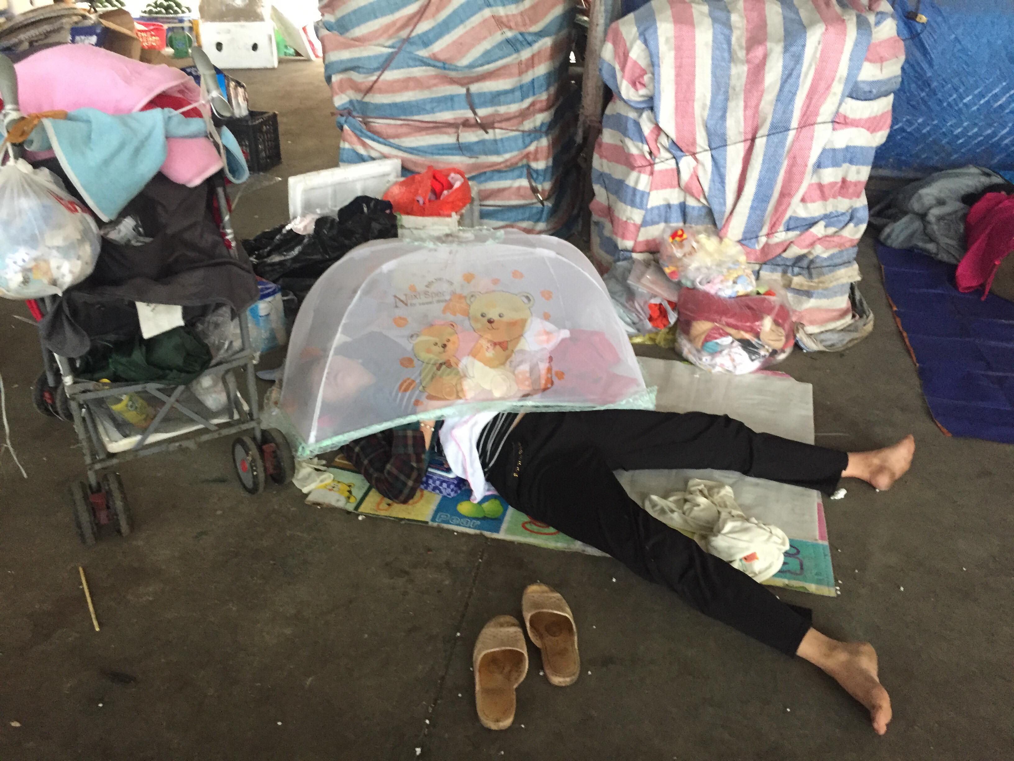 Chia tay khu trọ cũ của Nga, chúng tôi đi theo chỉ dẫn của mọi người ra chợ Long Biên tìm quanh thấy 2 mẹ con đang ngủ ngon lành dưới tấm bạt ở nền xi măng lạnh lẽo. Trên người cháu nhỏ, Nga đắp cho con cái chăn mỏng tang. Bỏ mặc những tiếng ồn ào bên ngoài, chợ người ra vào tấp nập, 2 mẹ con Nga vẫn say giấc, cạnh nơi 2 mẹ con Nga ngủ là một quán nước của một cụ bà.