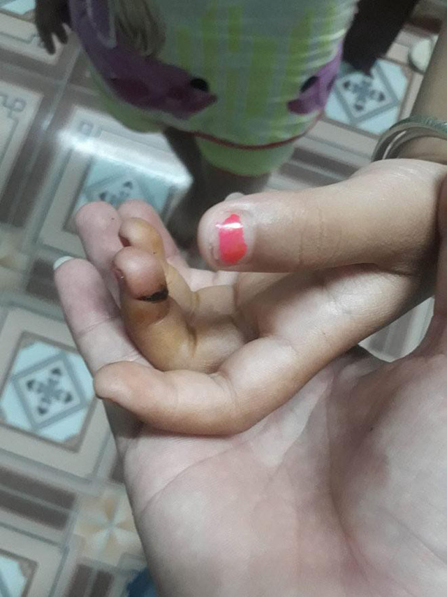Khi thấy bố dùng dao đâm mẹ, đứa bé cũng đã biết nhảy vào can ngăn. Nhưng thay vì dừng hành động dã man ấy, Kiên còn làm chính cô con gái nhỏ của mình bị thương.