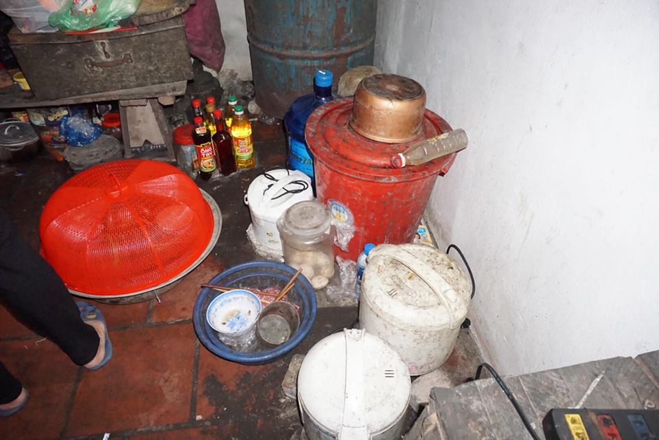Một góc nơi để nồi, thùng gạo để bà Hồ chuẩn bị cơm nước lo cho con gái.
