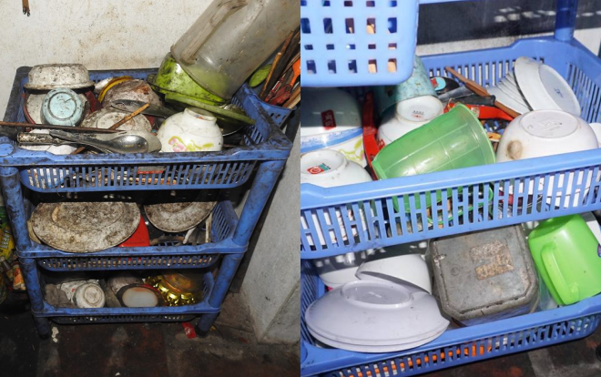 Hình ảnh giỏ đựng bát đũa trước và sau khi được mọi người giúp rửa sạch.