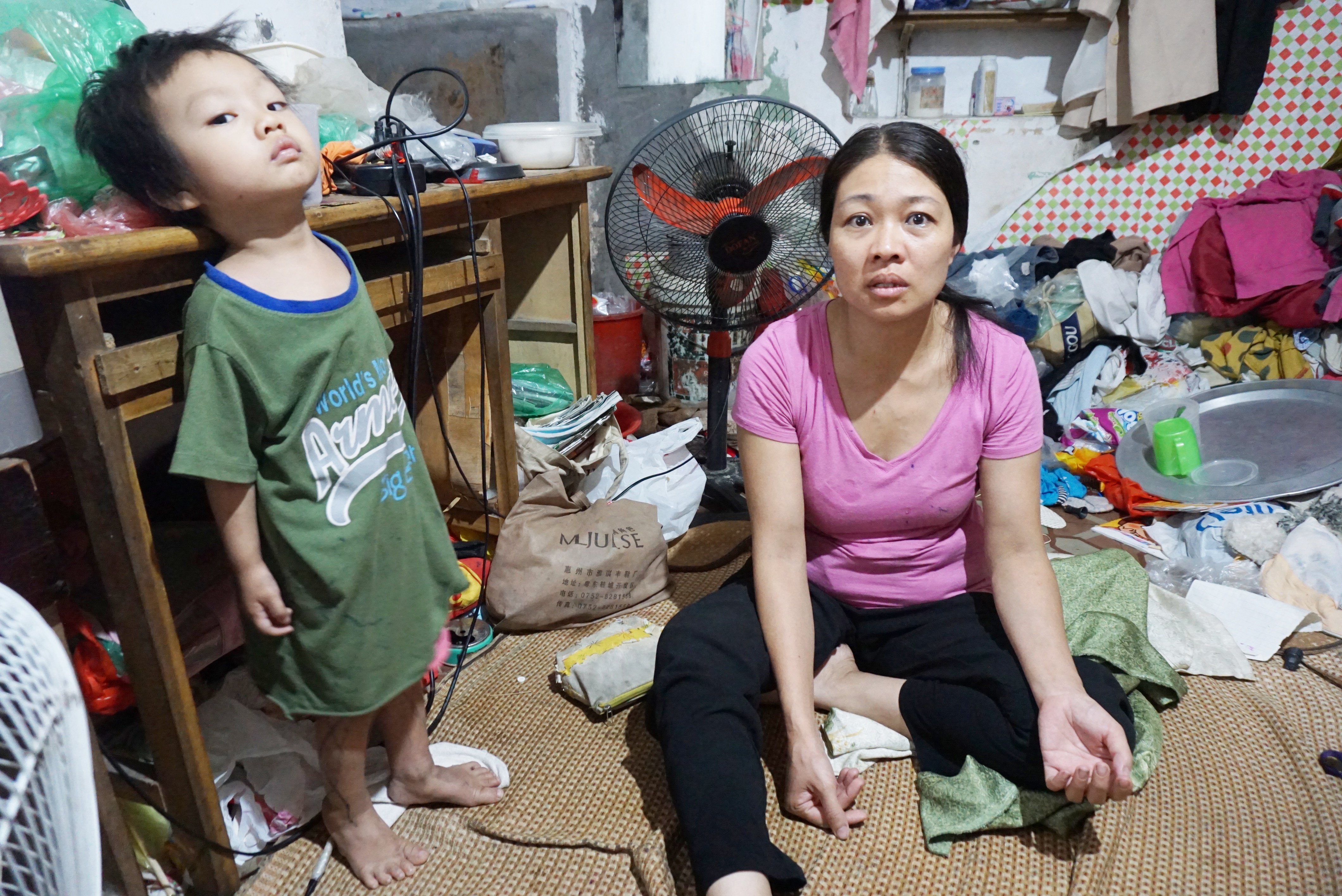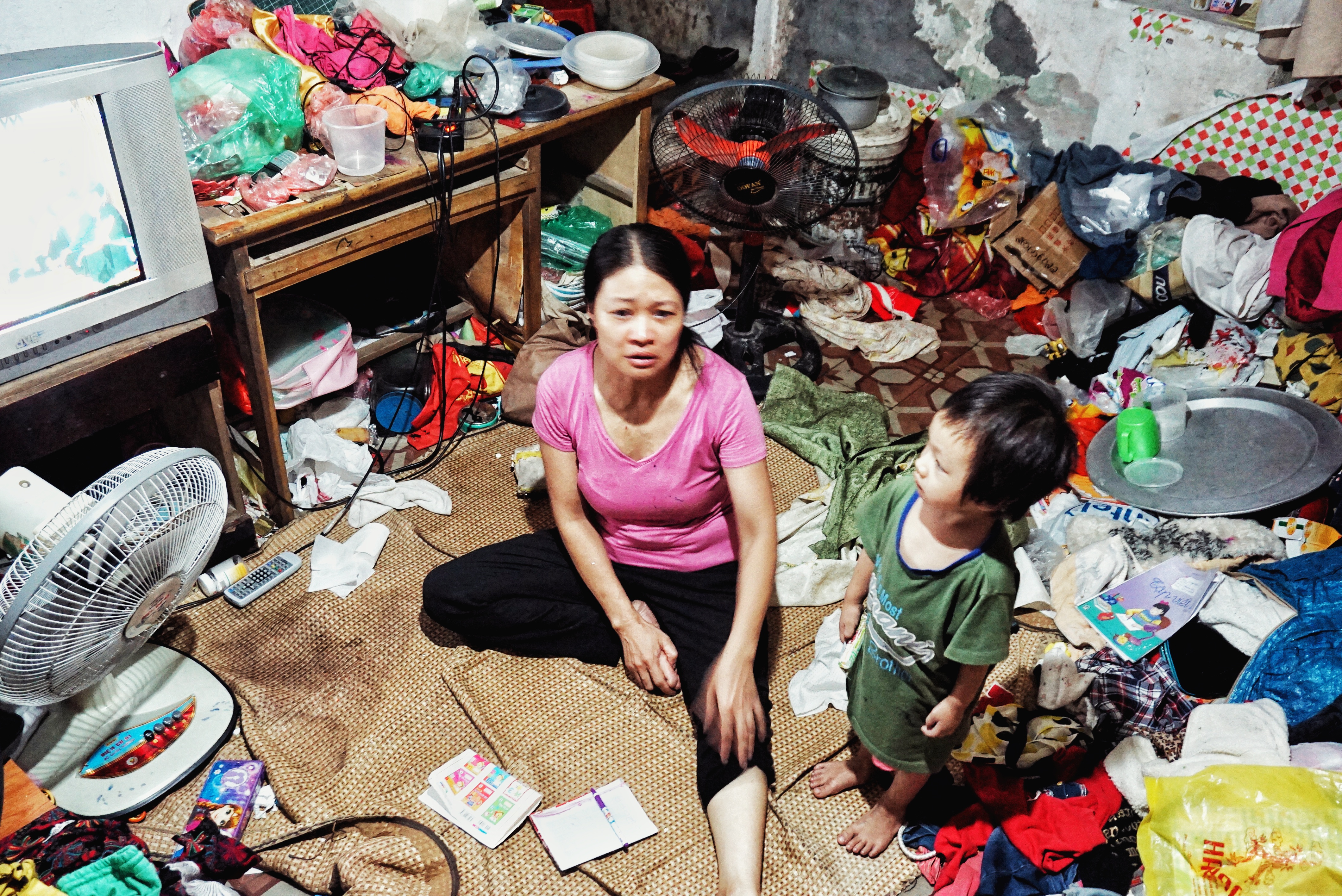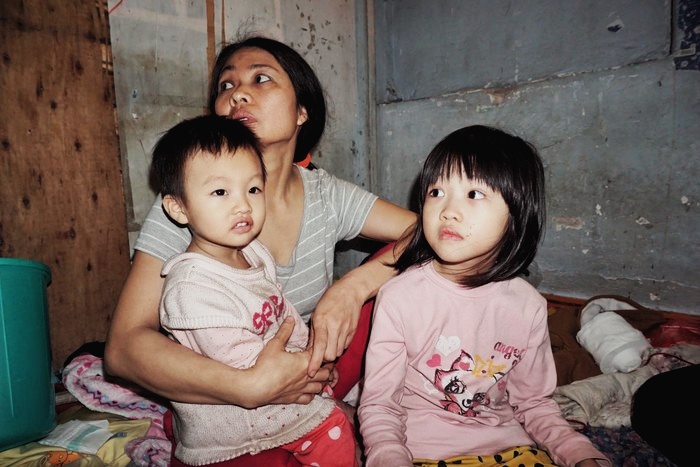 Gọi là nhà trọ nhưng khi bước vào đây có lẽ ai cũng sẽ choáng váng và hơi sốc bởi trong căn nhà đầy ẩm thấp ấy chứa đầy quần áo cũ kỹ, đã lâu không có người thu dọn. Hằng ngày chị Thanh vẫn ở đây cùng các con của mình.