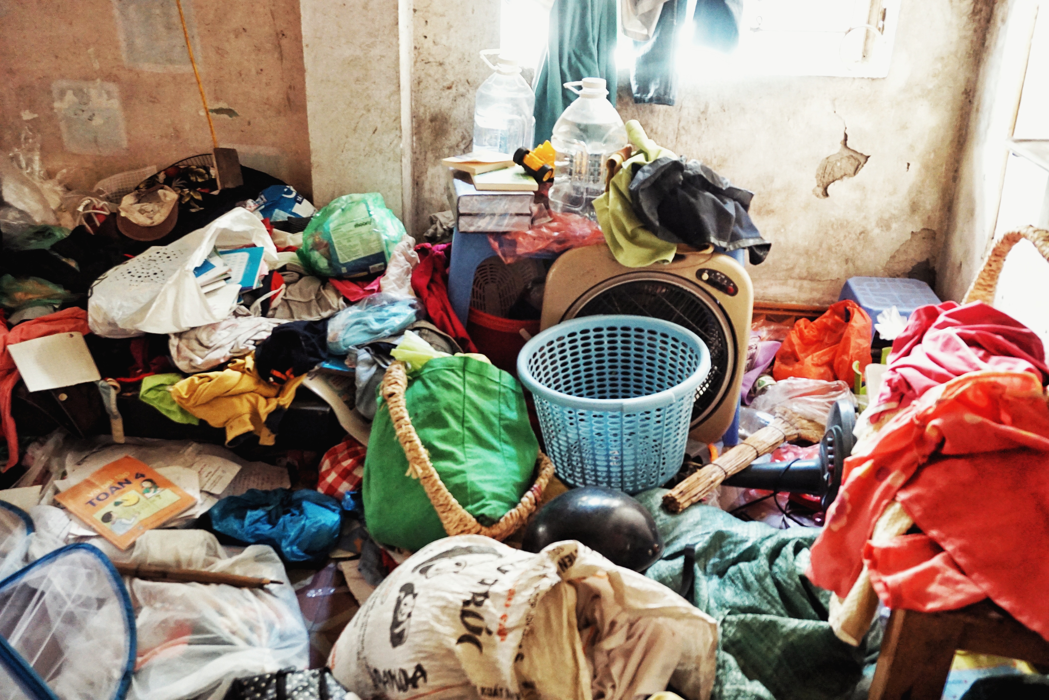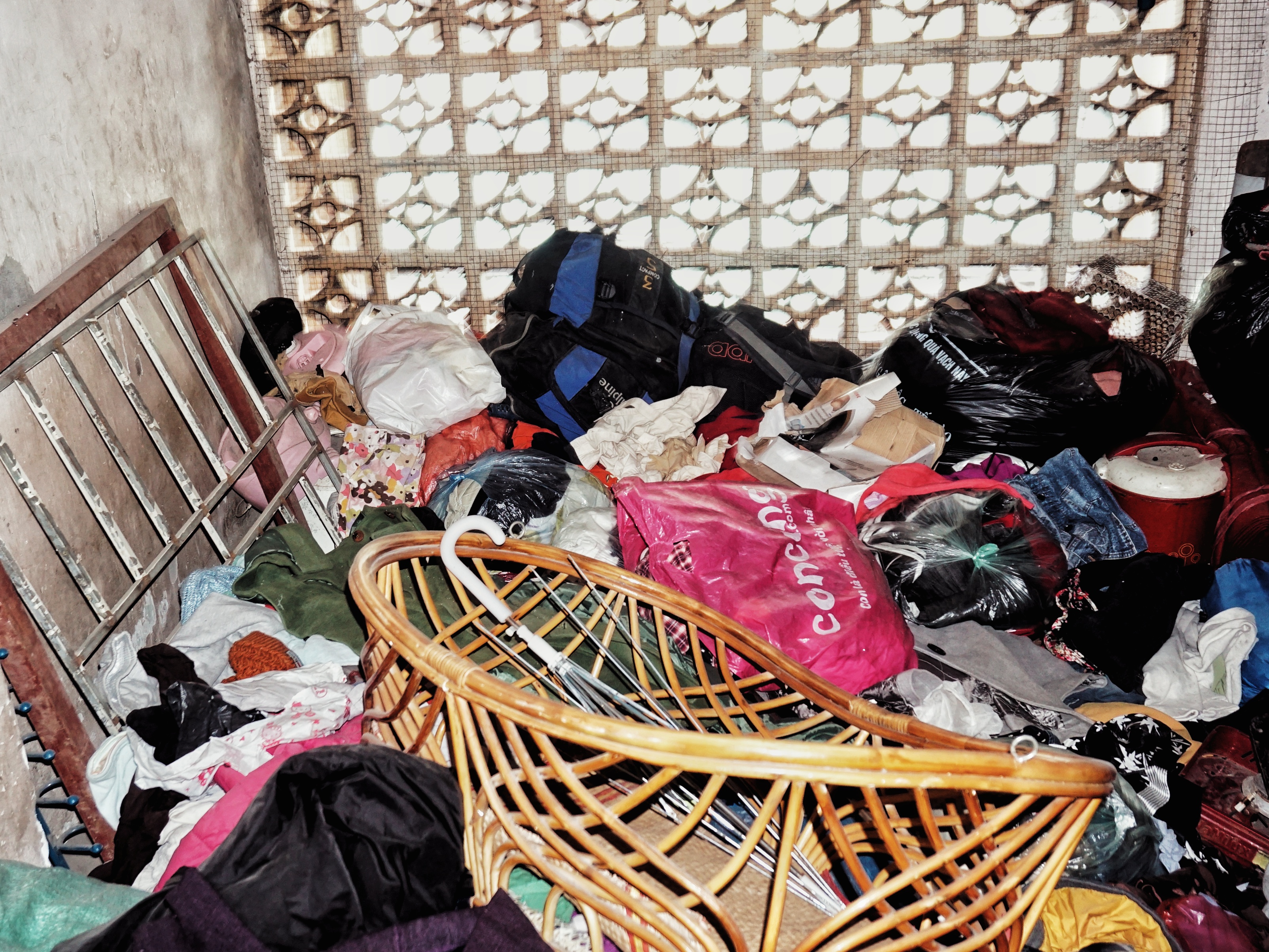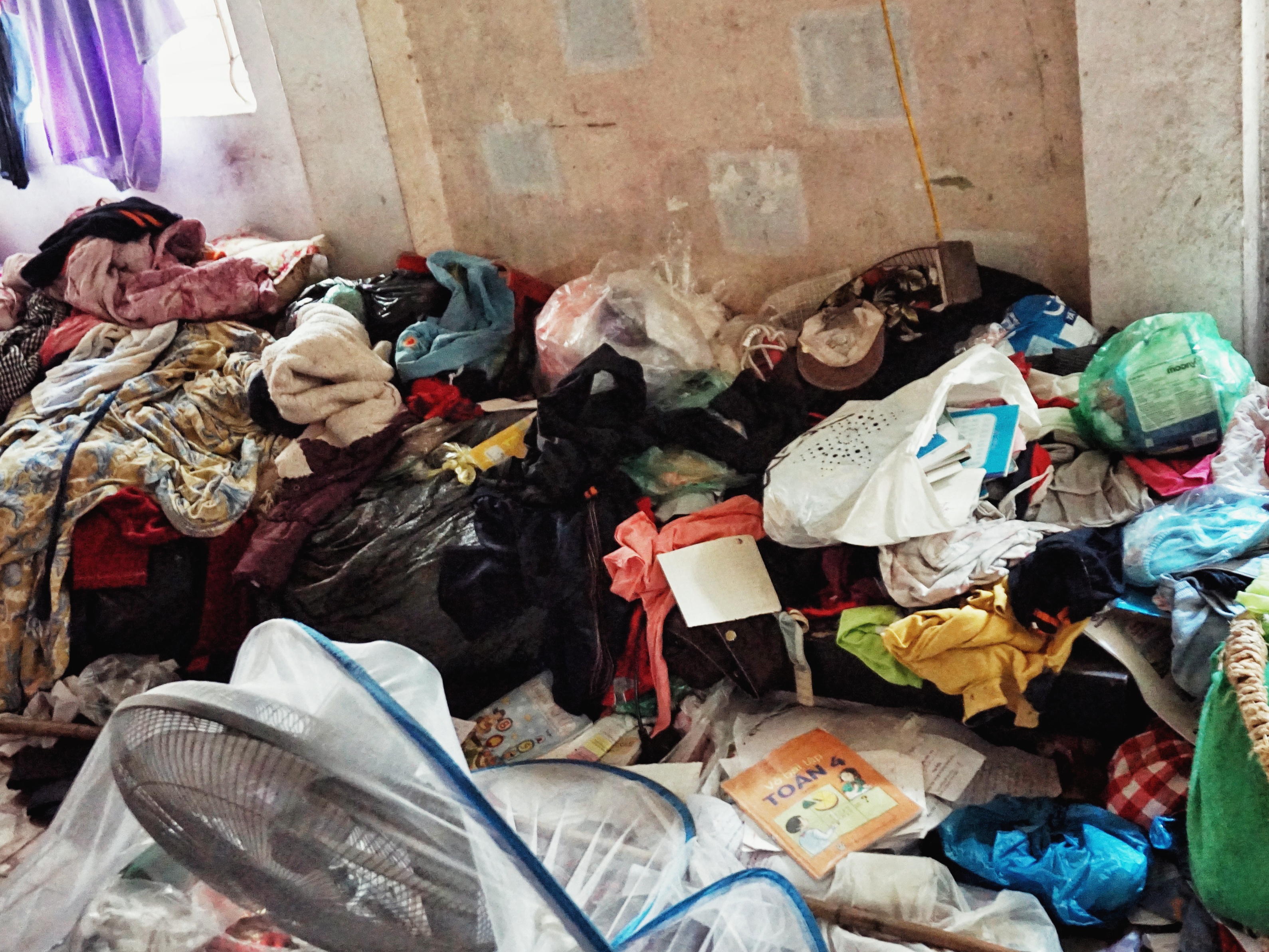Căn phòng chỉ rộng hơn 10m2 nhưng chứa đầy quần áo cũ.