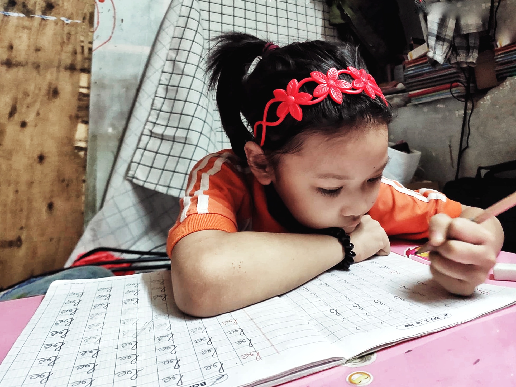 Theo chị Thanh, hiện bé Hoàng Anh đang học tại trường tiểu học Tô Hoàng cách nơi ở trọ không xa. Tiền ăn học của Hoàng Anh mỗi tháng hết 1,2 triệu đồng. Số tiền này cô bé được một đơn vị vì thương cho hoàn cảnh nên đã giúp đỡ.