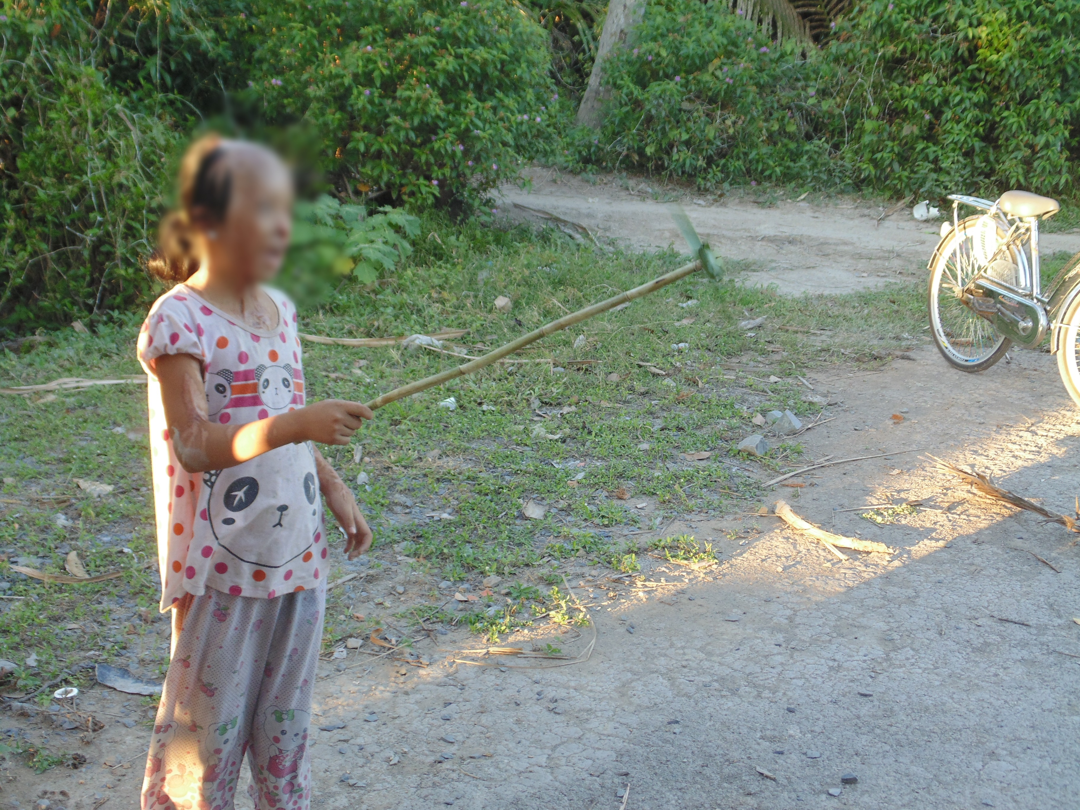 Hỏi về ước mơ của mình, Nhi chia sẻ: “Em mong được đi học như các bạn, sau này trở thành công an để bảo vệ người khác”. Nói xong Nhi lại lủi thủi chơi chóng chóng một mình, cảm nhận chong chóng quay trong gió bằng đôi tai.