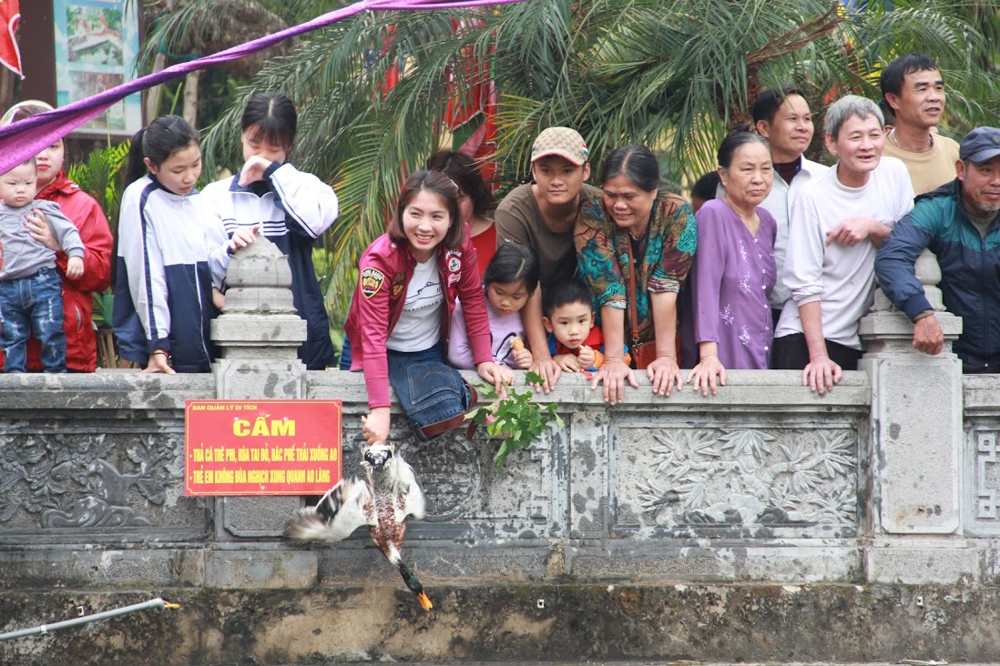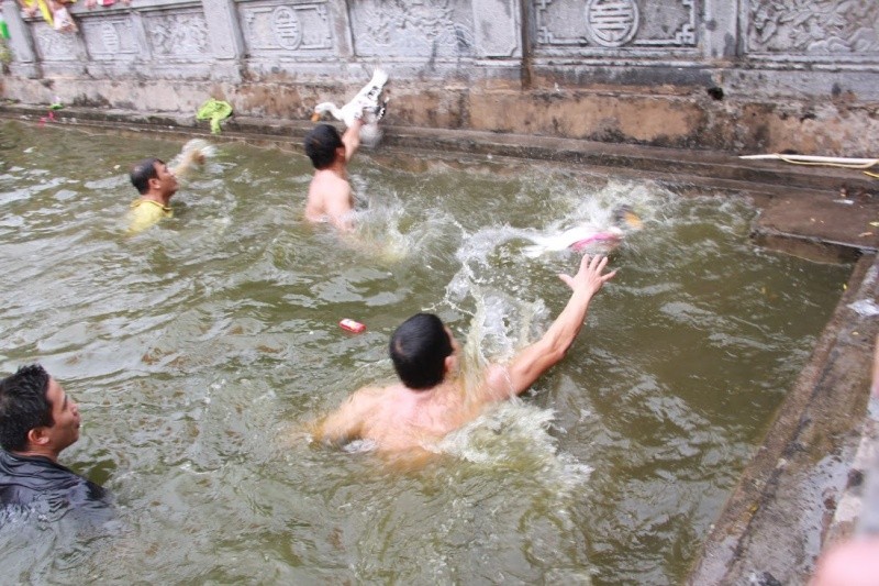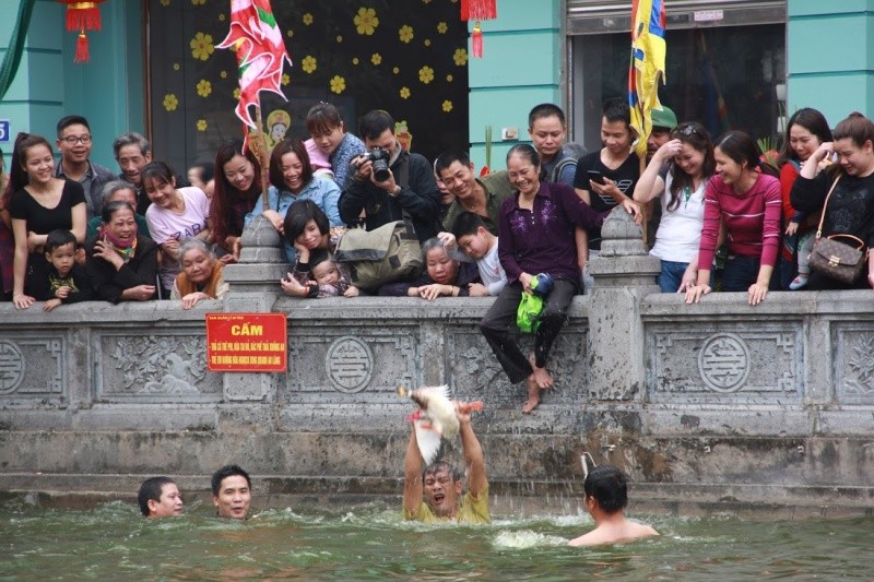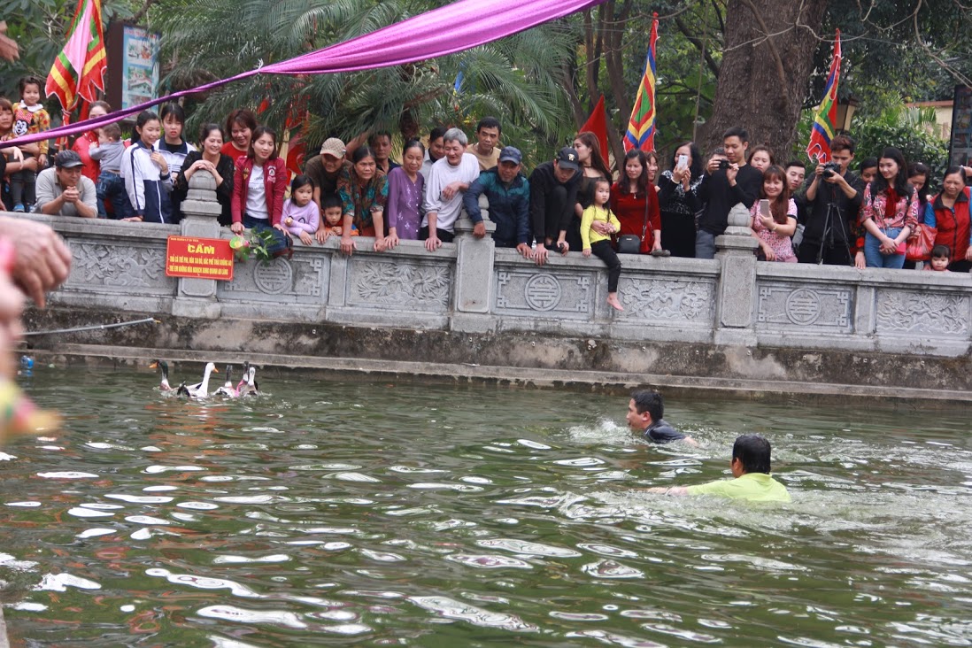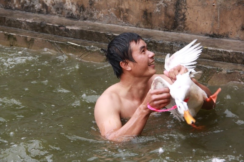 7 con vịt được thả xuống hồ nước trước cửa đình làng. Nhiệt độ dưới nước khá lạnh nhưng trai làng ai ai cũng phấn khởi tham gia.