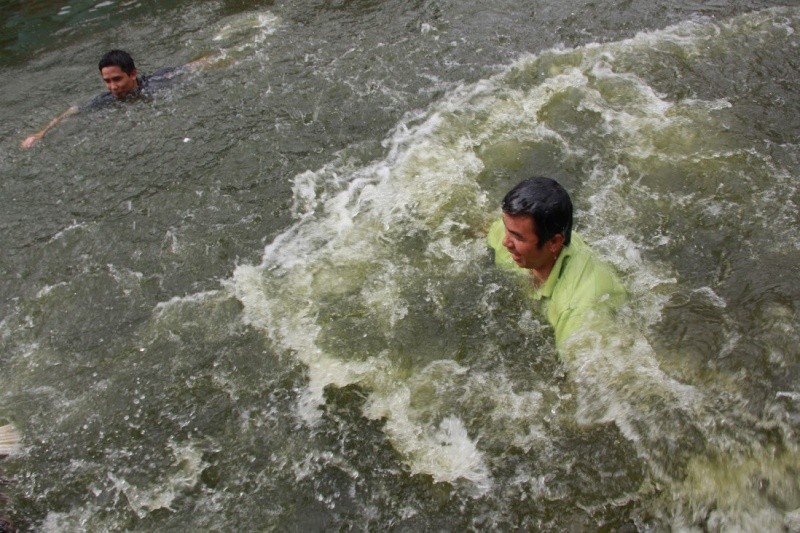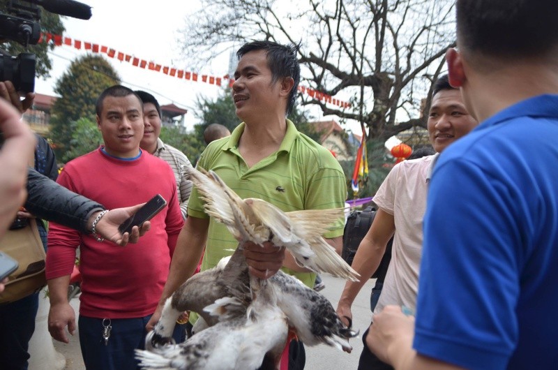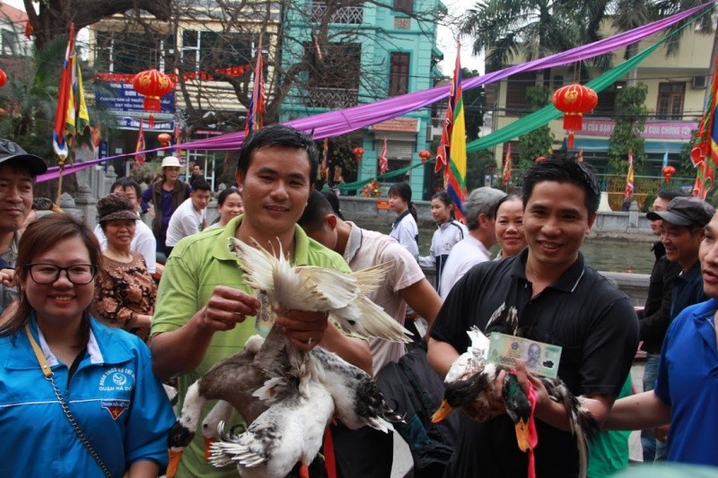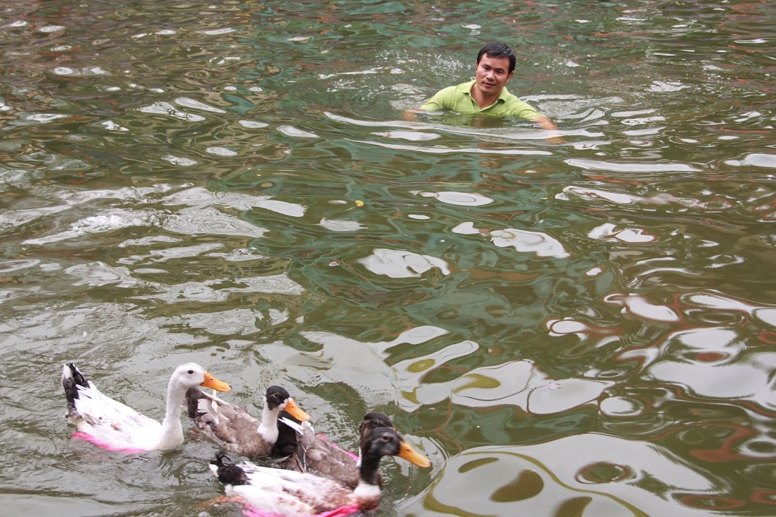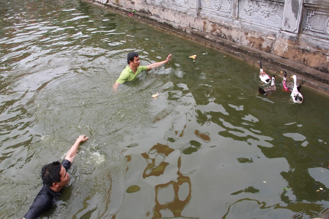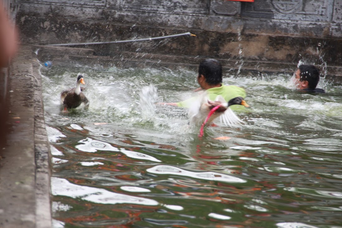 7 con vịt được thả xuống hồ nước trước cửa đình làng. Nhiệt độ dưới nước khá lạnh nhưng trai làng ai ai cũng phấn khởi tham gia.