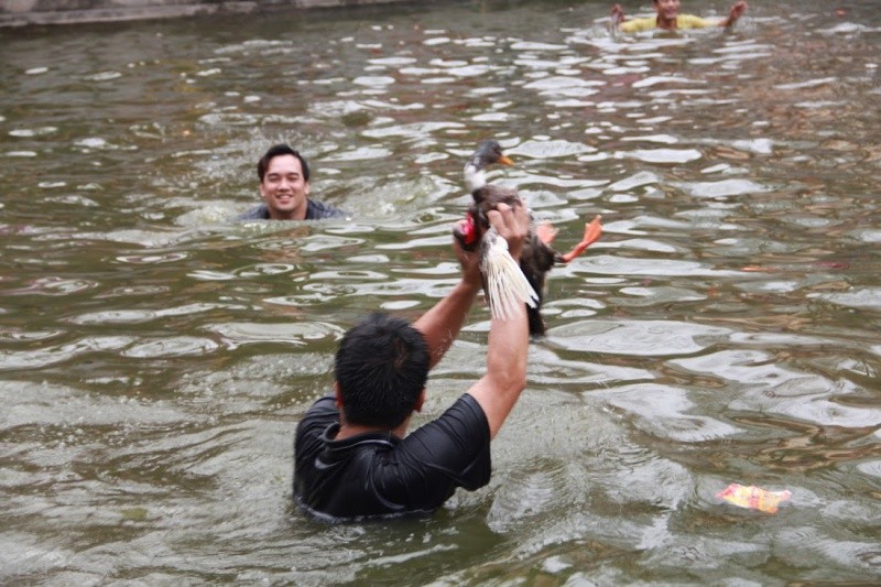 Những người tham gia trò chơi phải xuống hồ nước sau đó khéo léo bắt những con vịt đang bơi.