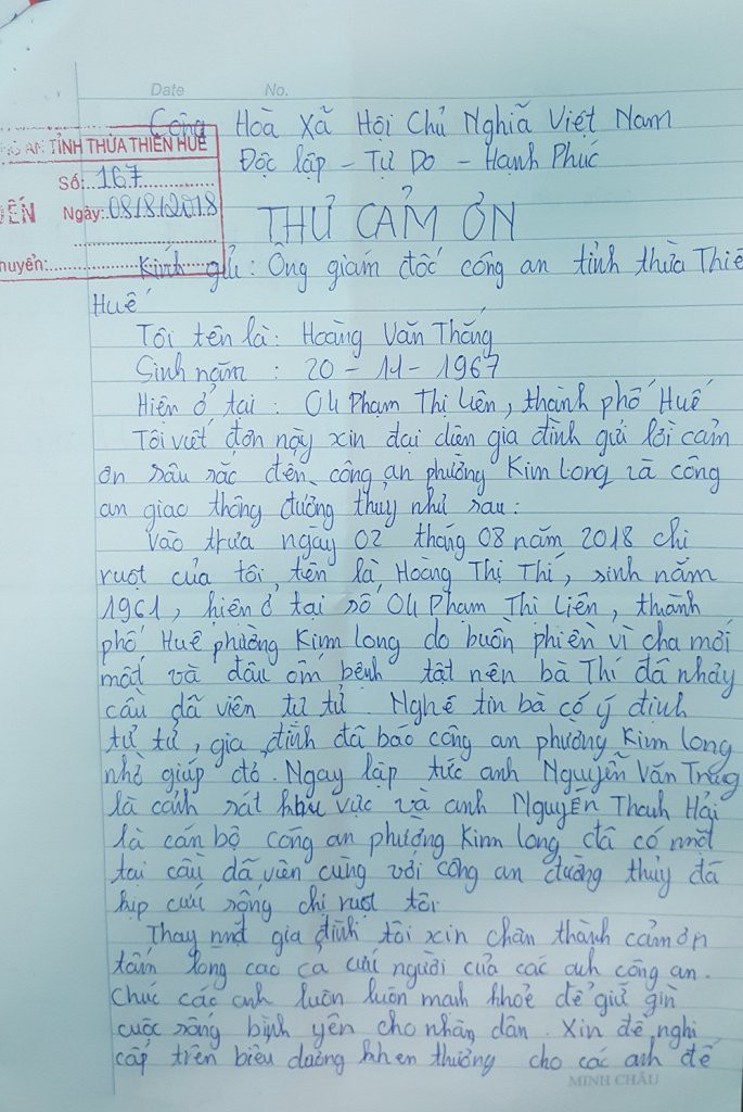 Ngày 11/8, một cán bộ Công an tỉnh Thừa Thiên - Huế cho biết, sau khi lực lượng Công an phường Kim Long (TP Huế) và Phòng CSGT Đường thuỷ Công an tỉnh Thừa Thiên - Huế cứu một phụ nữ nhảy cầu tự tử, người thân của người này viết thư gửi đến công an tỉnh để cảm ơn.