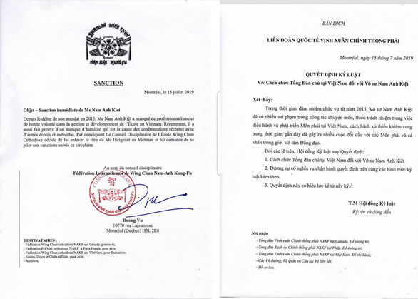 Quyết định cách chức ông Kiệt của Liên đoàn quốc tế Vịnh Xuân chính thống phái. (Ảnh: Tuổi Trẻ).