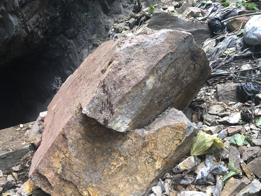 Tảng đá khoảng 4 tấn lở từ trên vách núi đè trúng 2 mẹ con. Ảnh: Lao Động