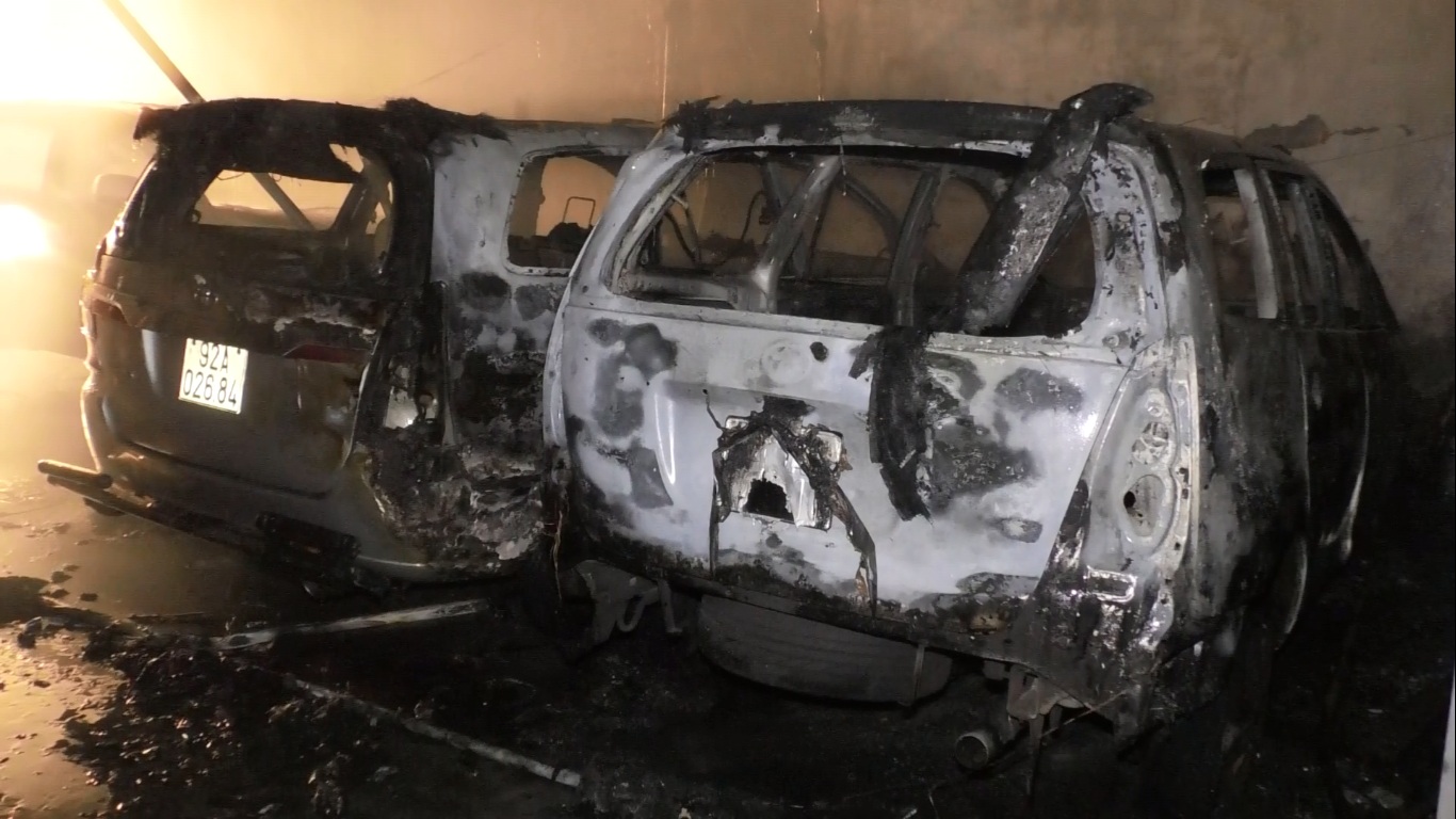 Vụ cháy khiến nhiều ô tô và tài sản trong gara bị thiêu rụi. Ảnh: CTV