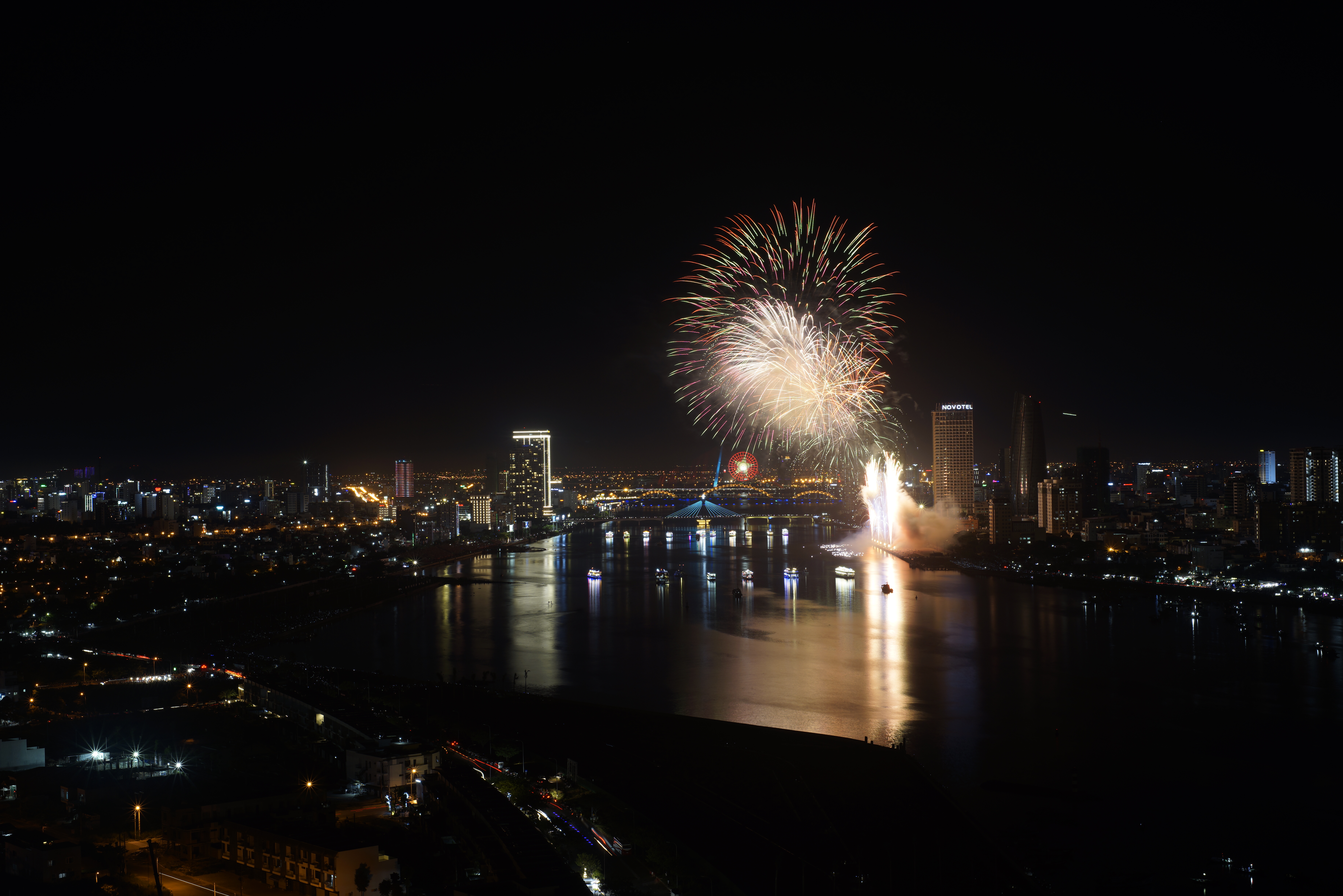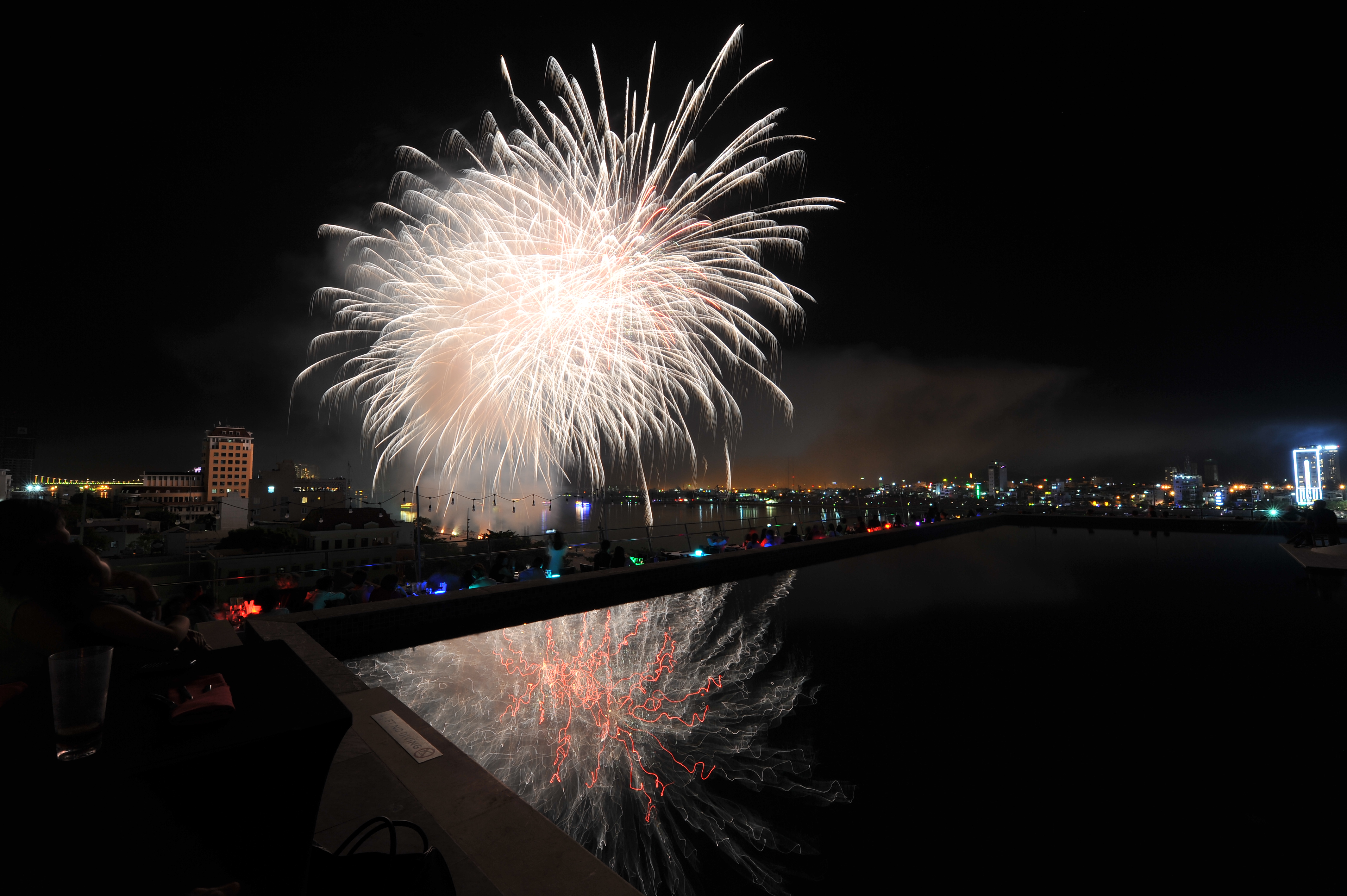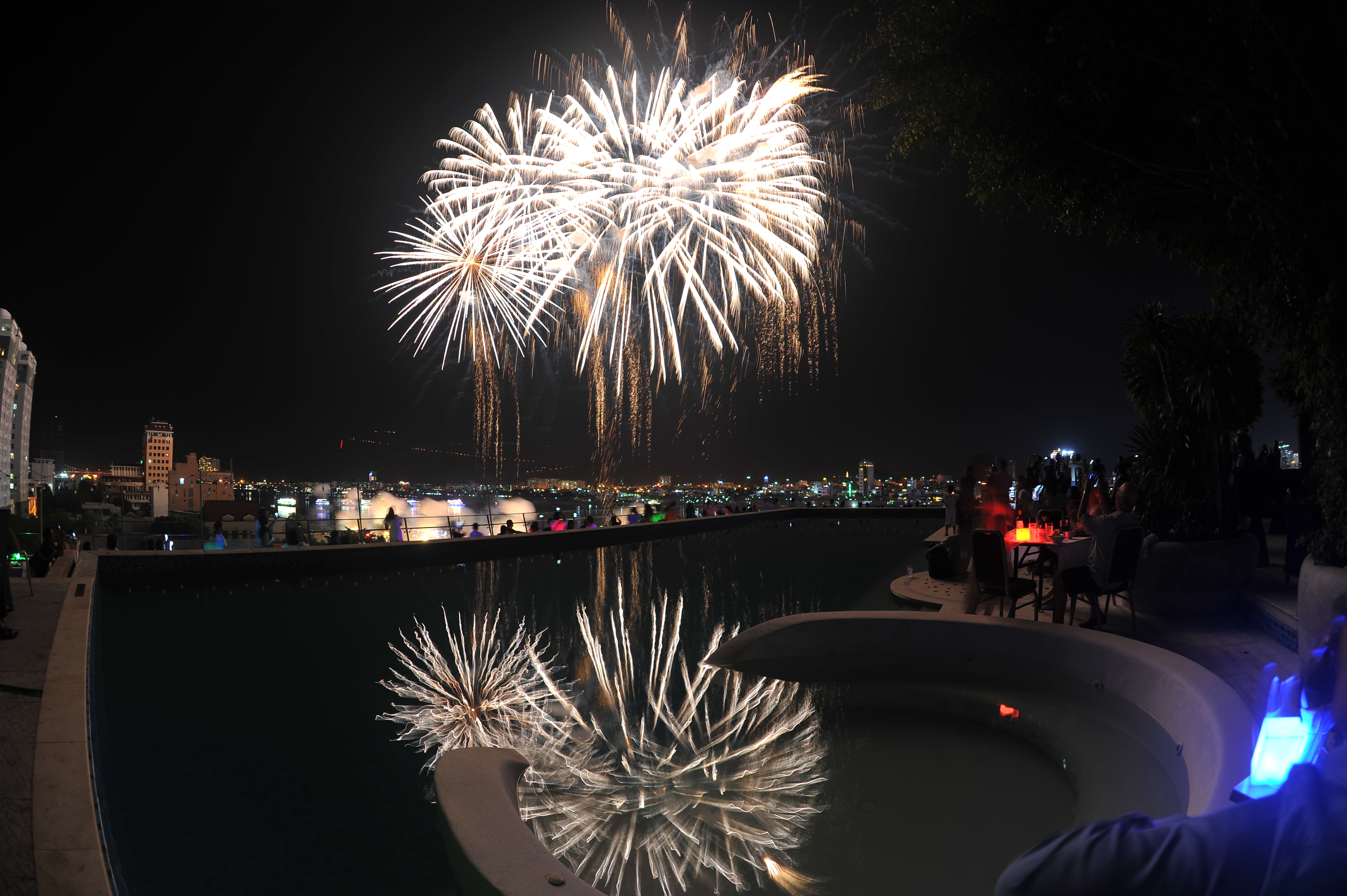 Mãn nhãn với đại tiệc pháo hoa trong đêm khai mạc khi nhìn từ hồ bơi khách sạn cao nhất Đà Nẵng.