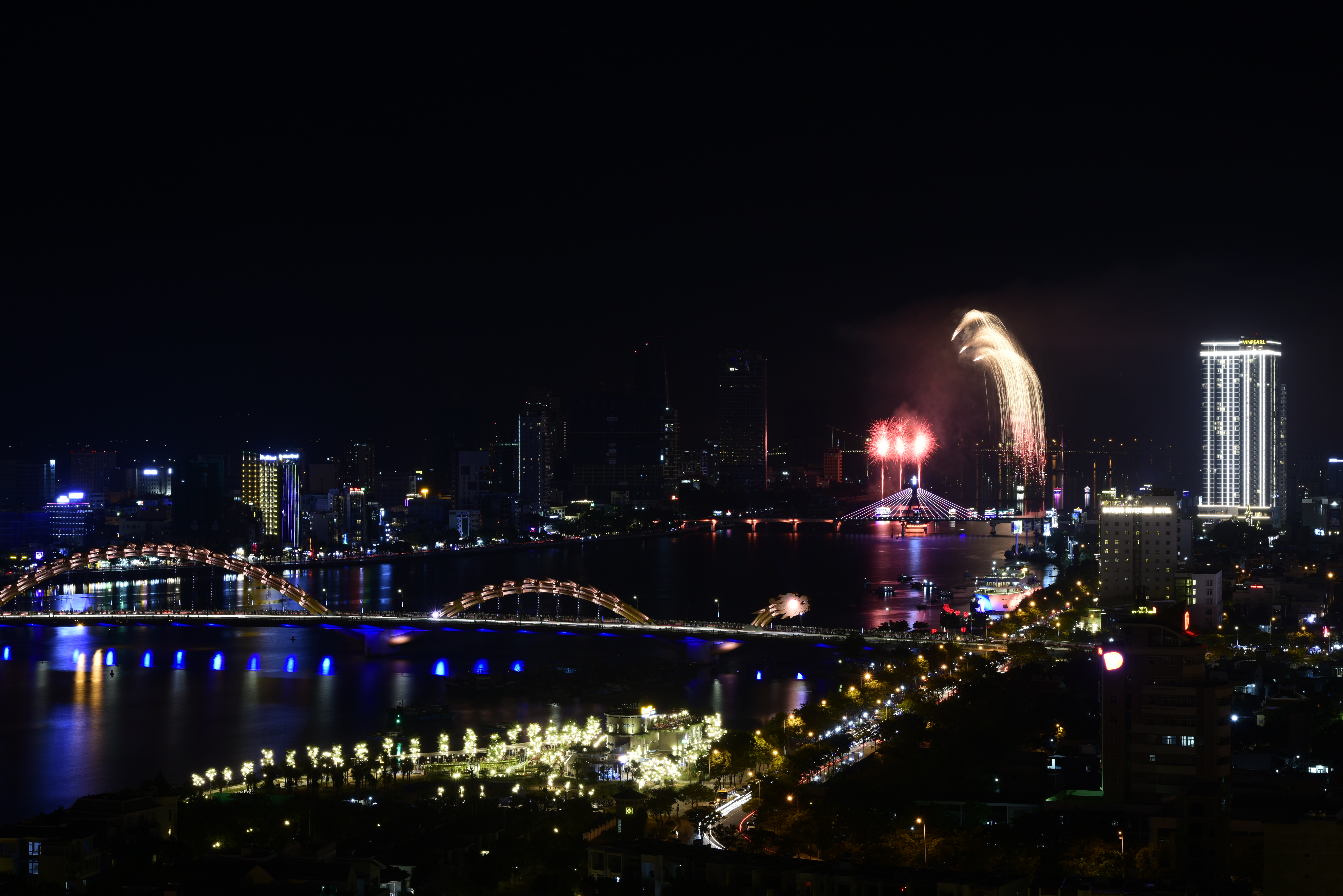 Những tia lửa lấp lánh, bung tỏa khắp bầu trời, phản chiếu trên mặt nước khiến Đà Nẵng lung linh từ trên cao trong đêm khai mạc lễ hội pháo hoa.