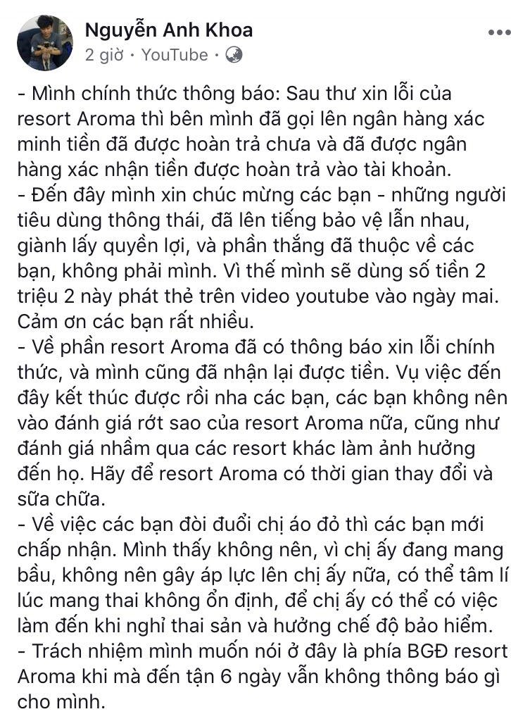 Trên trang Facebook cá nhân, Youtuber Khoa Pug cho biết, resort Aroma đã có thông báo xin lỗi chính thức, và anh cũng đã nhận lại được tiền. Kết quả này là nhờ cộng đồng mạng - những người tiêu dùng thông thái, đã lên tiếng bảo vệ lẫn nhau, giành lấy quyền lợi, và phần thắng thuộc về tất cả mọi người chứ không phải của mình.
