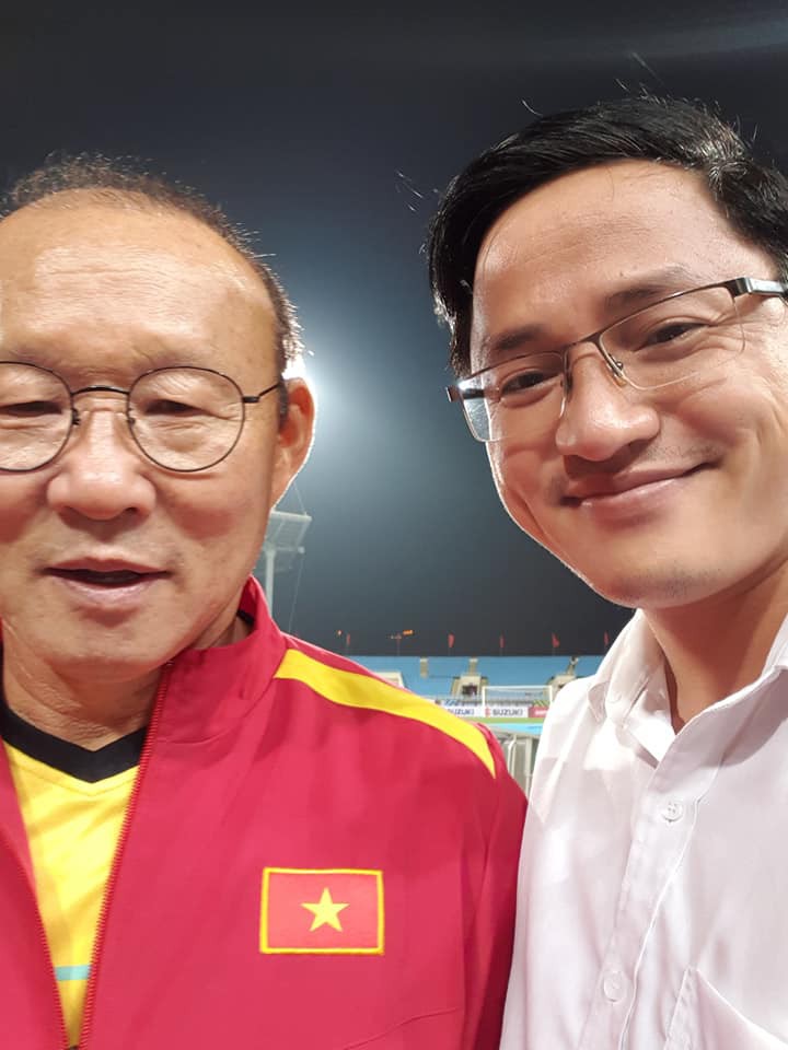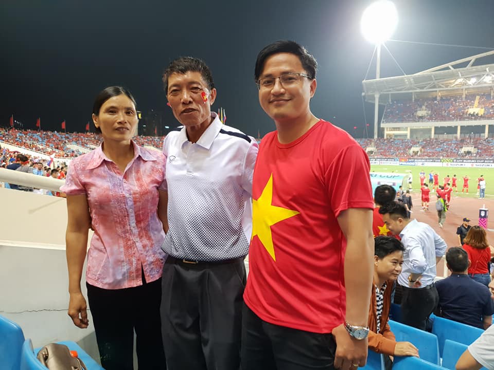 “Thầy phong thủy” gặp gỡ và chụp ảnh kỷ niệm cùng bố mẹ tuyển thủ Đoàn Văn Hậu trên khán đài A, sân vận động Mỹ Đình tối qua 6/12, trong thời gian trước khi trận đấu giữa tuyển Việt Nam và tuyển Philippines diễn ra.