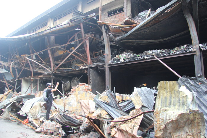 Khu nhà xưởng tan hoang sau đám cháy.