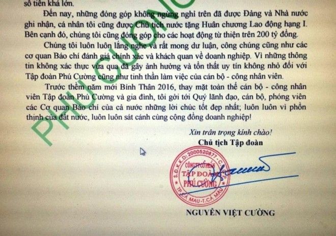 Liên quan đến những thông tin bất lợi cho Phú Cường sau khi ông Cường tổ chức đám cưới hoành tráng, đại gia nói rằng báo viết sai sự thật ở nội dung: “Cuối năm 2013, ông Nguyễn Việt Cường, Chủ tịch HĐQT, từng gửi đơn xin cứu xét khẩn cấp đến Thống đốc Ngân hàng Nhà nước Nguyễn Văn Bình về khoản nợ 1.325 tỷ đồng.